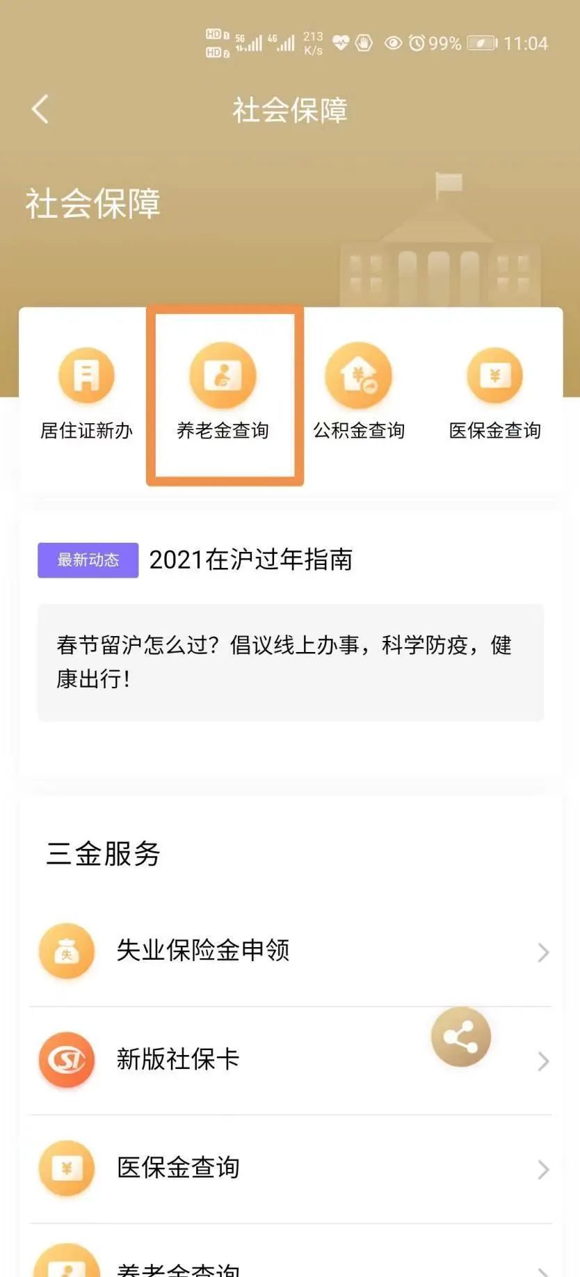 点击进入“养老金查询”栏目。