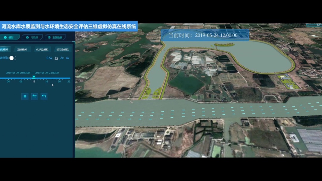 河流水库水质监测与水环境生态安全评估三维虚拟仿真在线系统的水动力模拟,图中箭头为水流方向和流速
