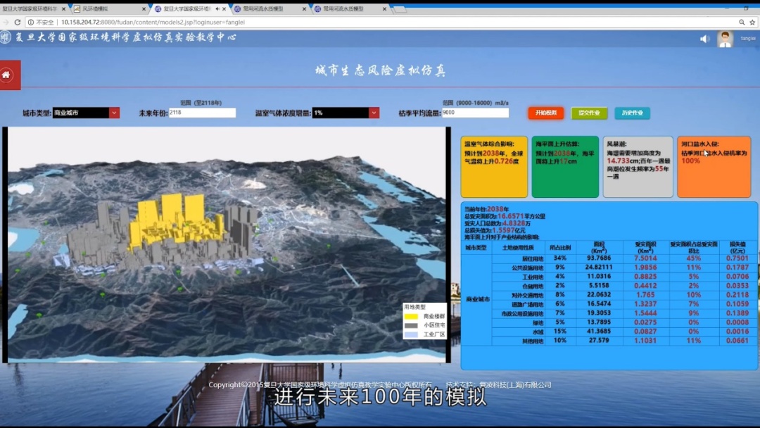 城市生态虚拟仿真系统的未来100年海平面上升模拟,展示了商业城市在2118年时温室气体增量1%的海平面上升情况