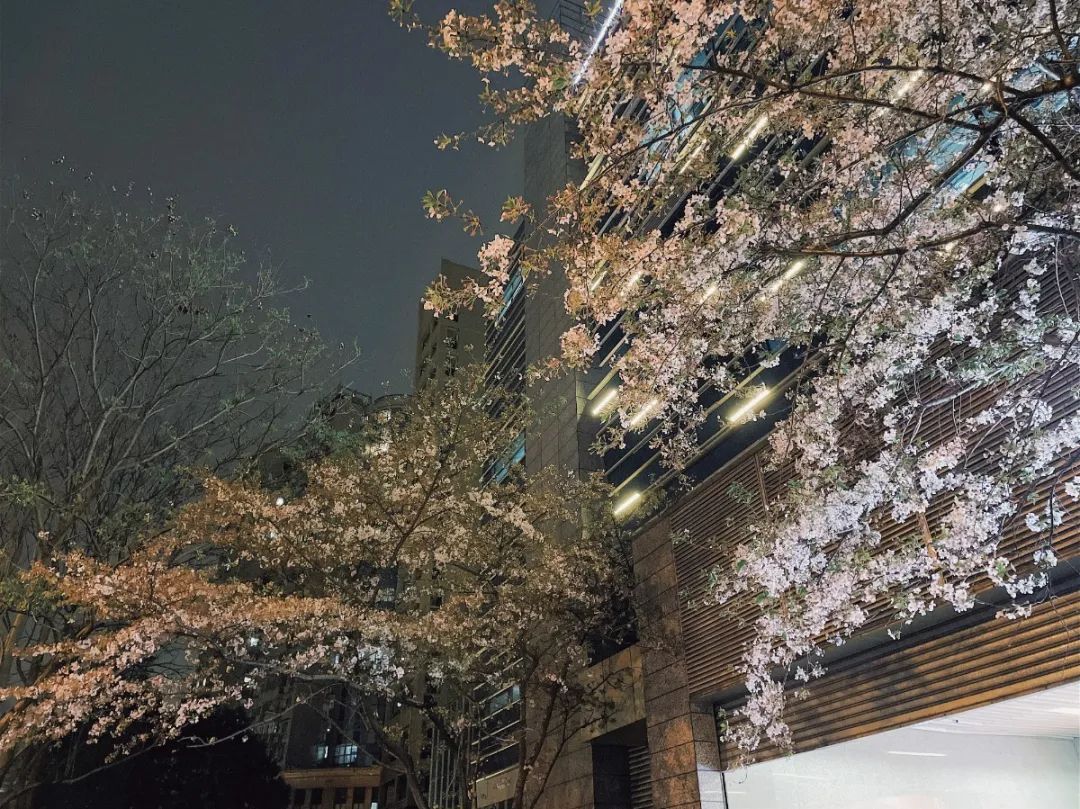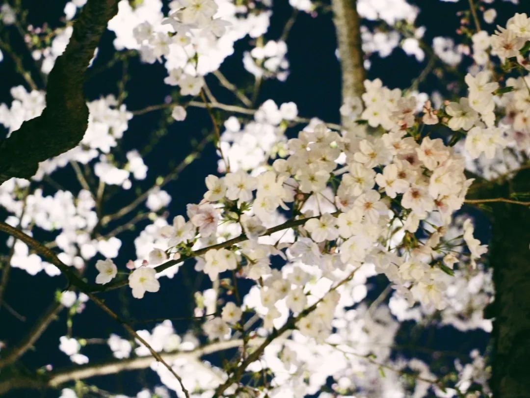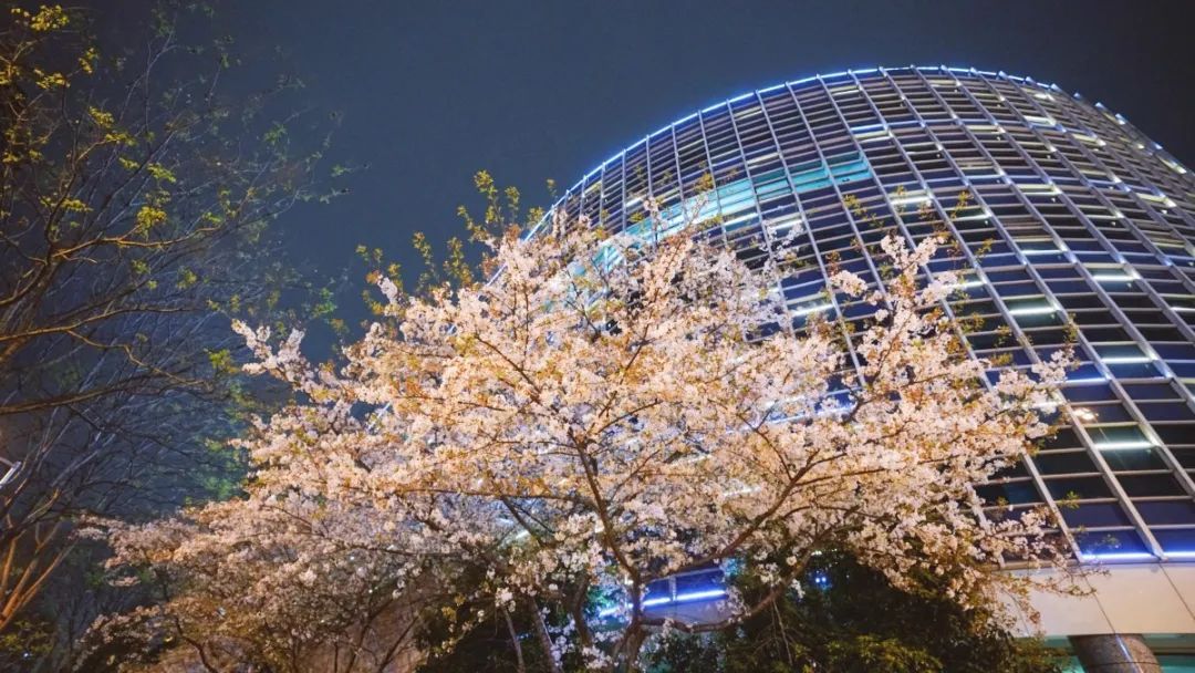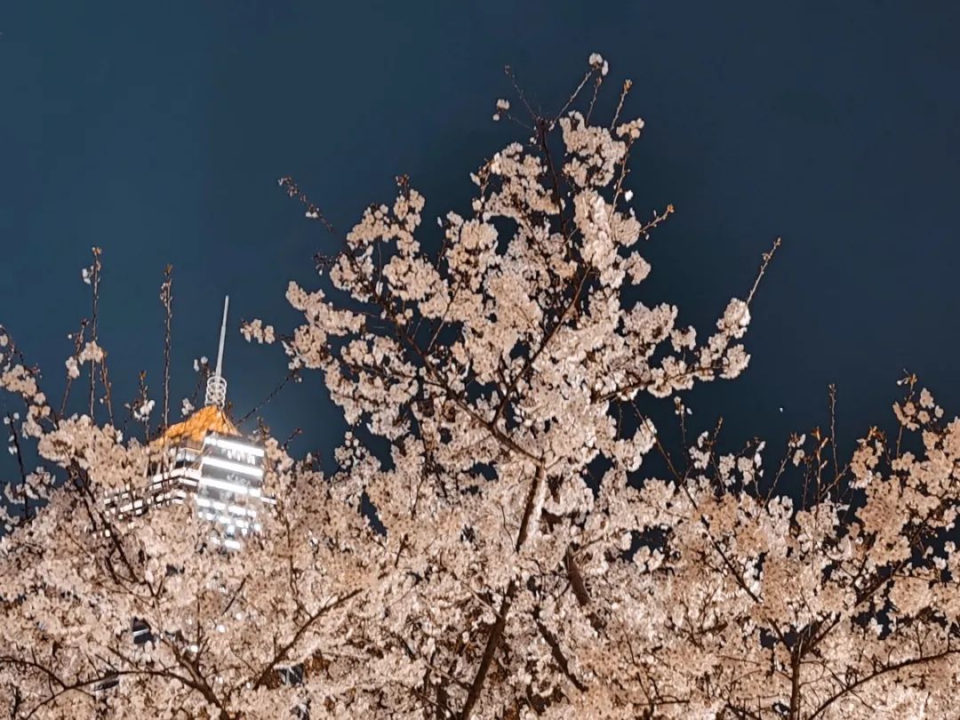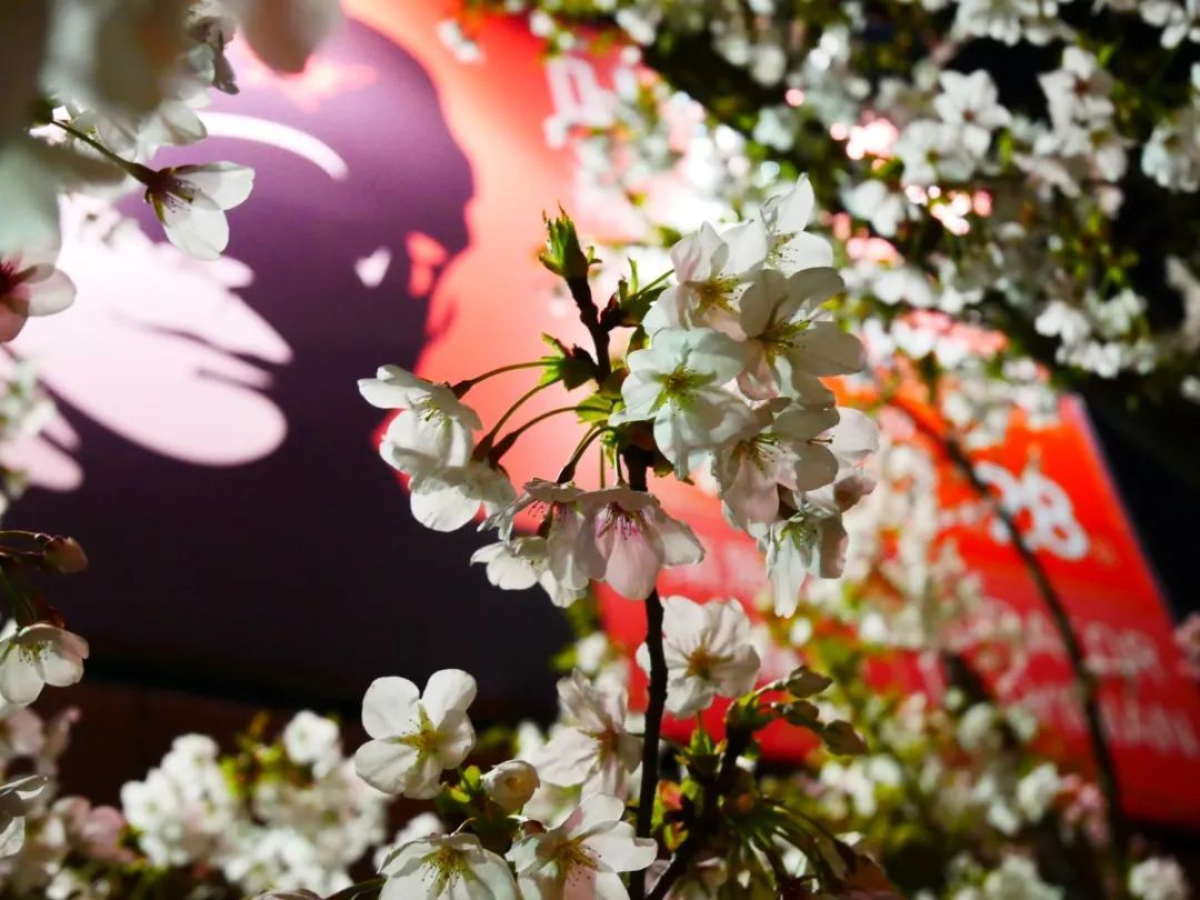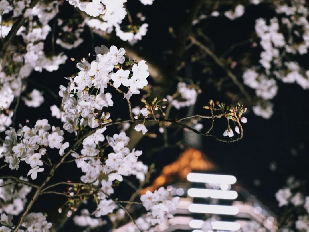 夜如水,樱如雪,看过了阳光下纯白皎洁的樱花,霓虹灯下的夜樱浮现在漆黑的夜空中透出妩媚又别样的姿态,又是另一种绚丽动人。