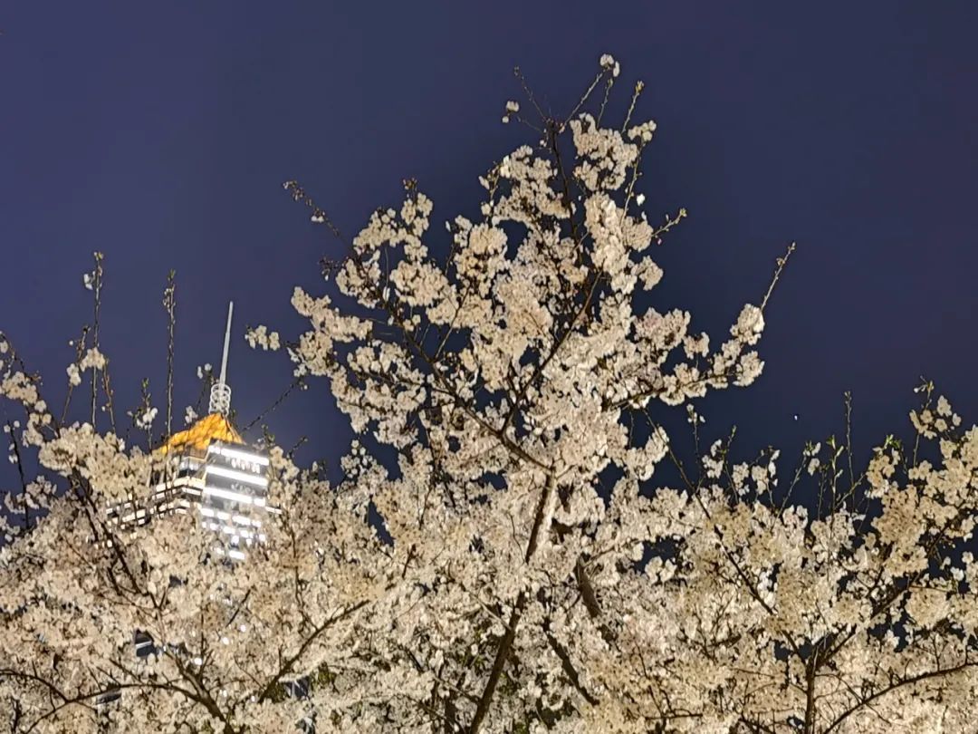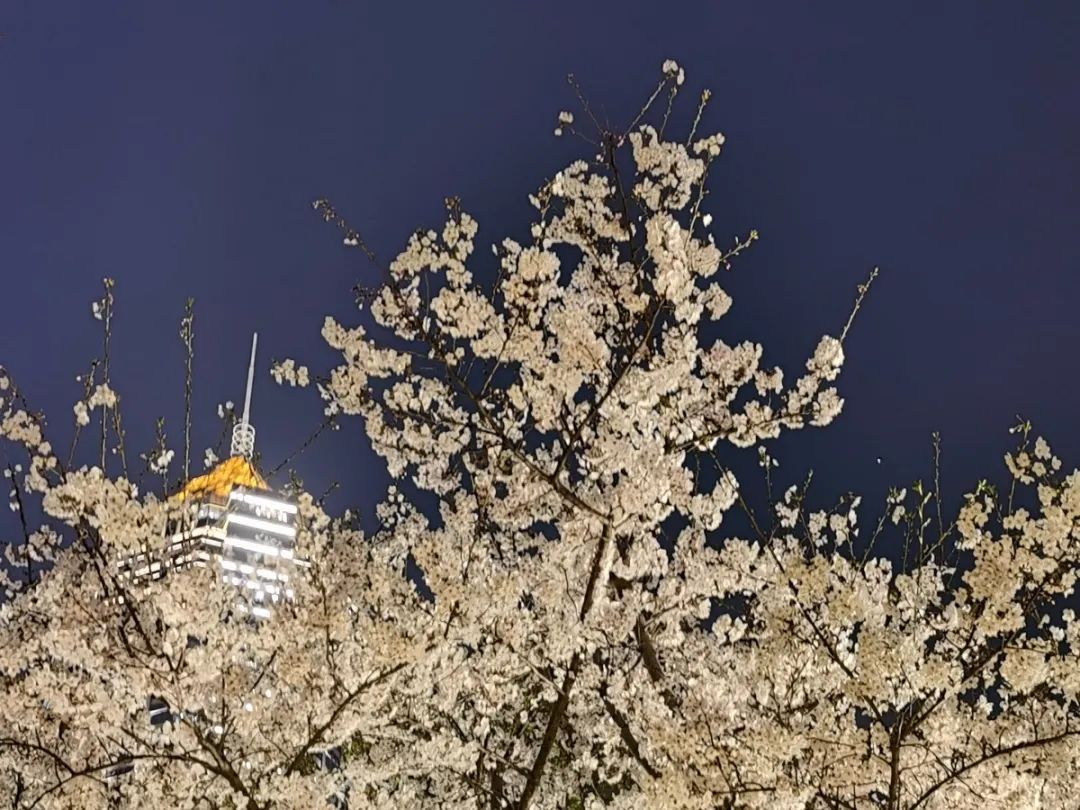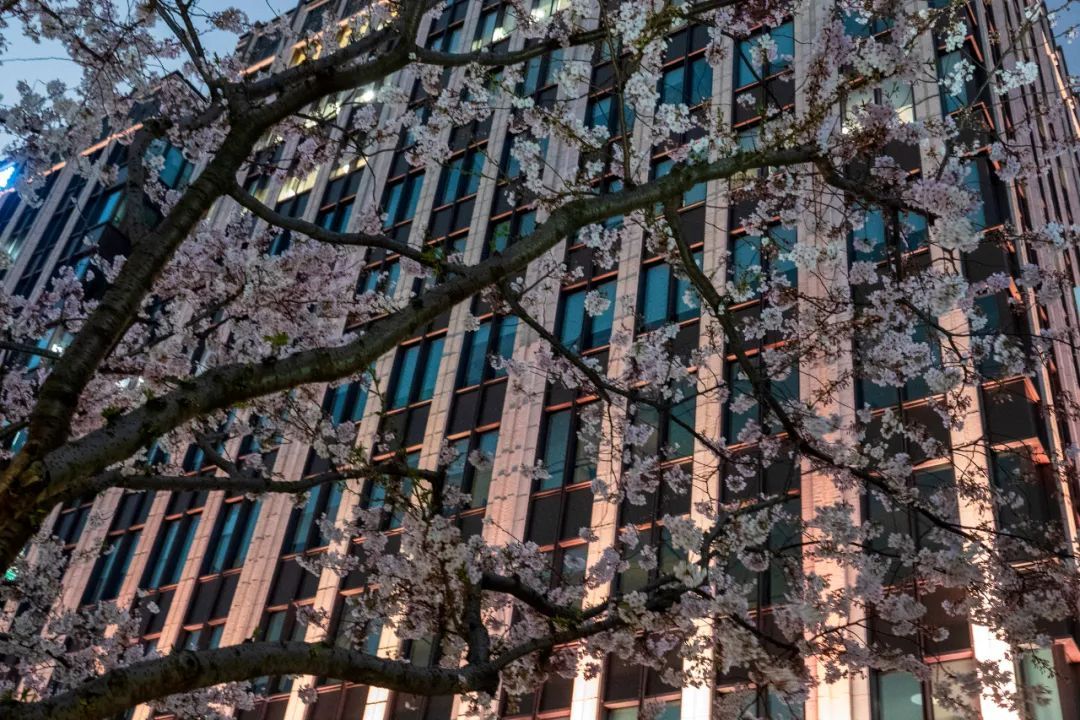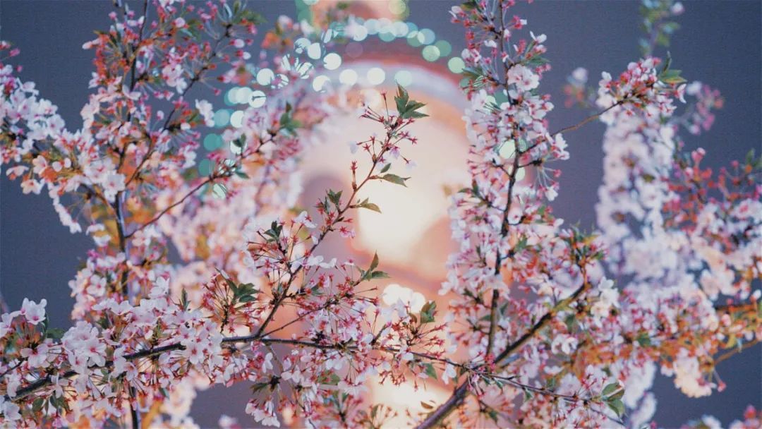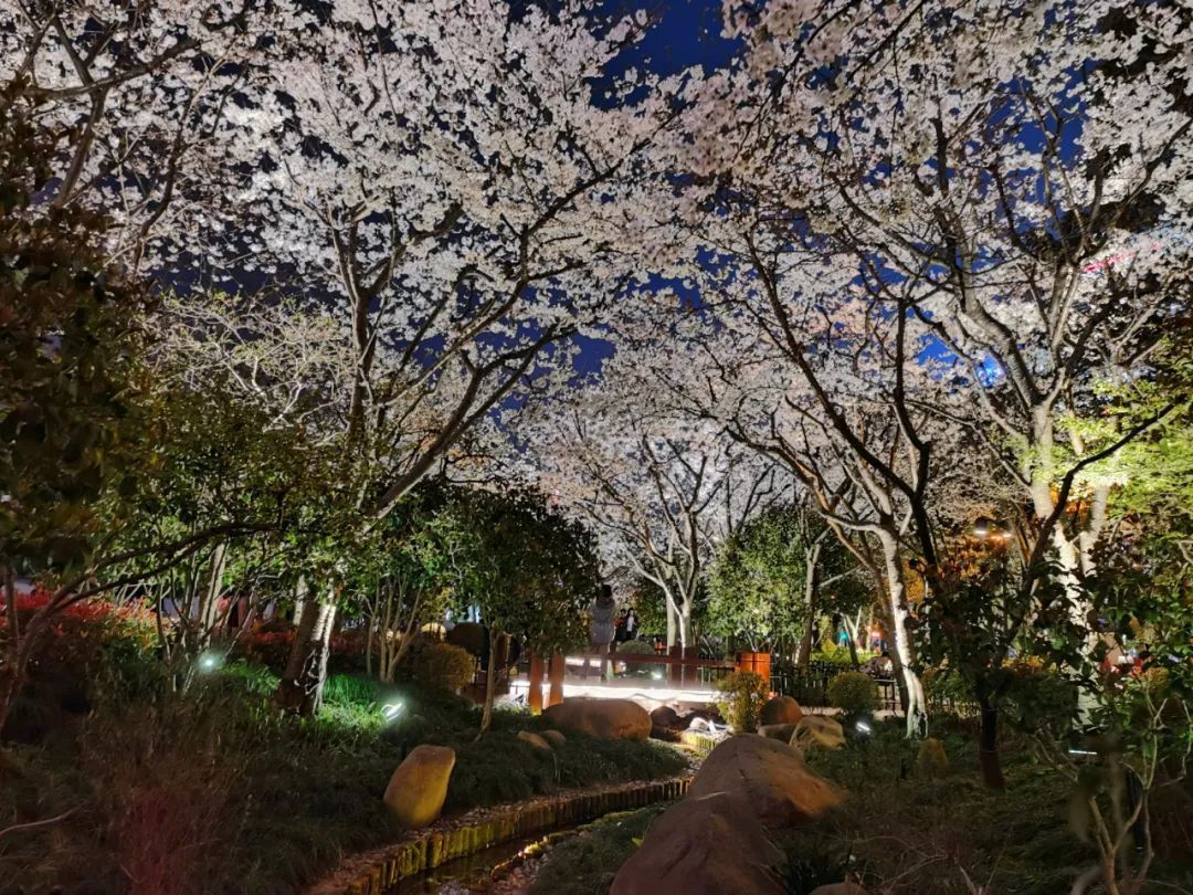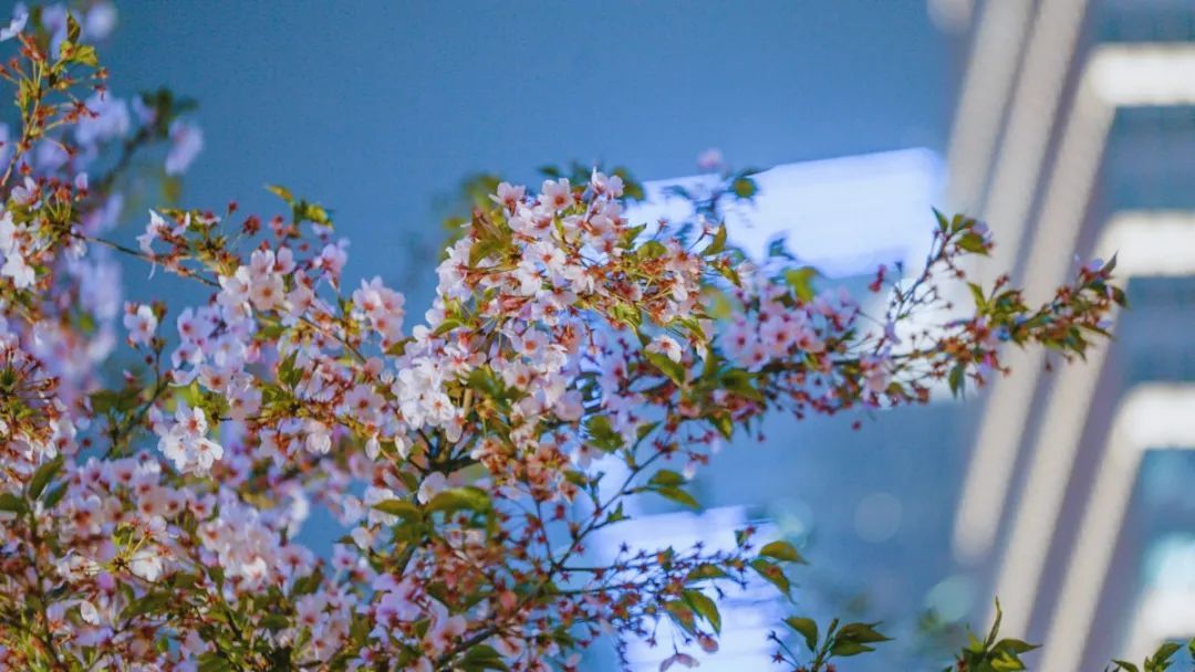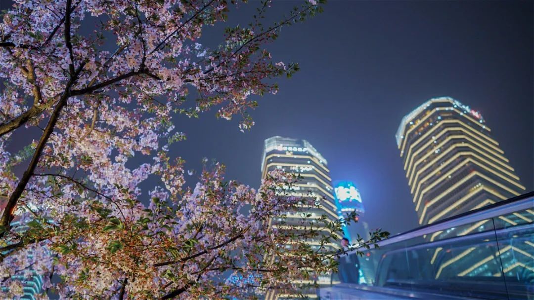 夜如水,樱如雪,看过了阳光下纯白皎洁的樱花,霓虹灯下的夜樱浮现在漆黑的夜空中透出妩媚又别样的姿态,又是另一种绚丽动人。