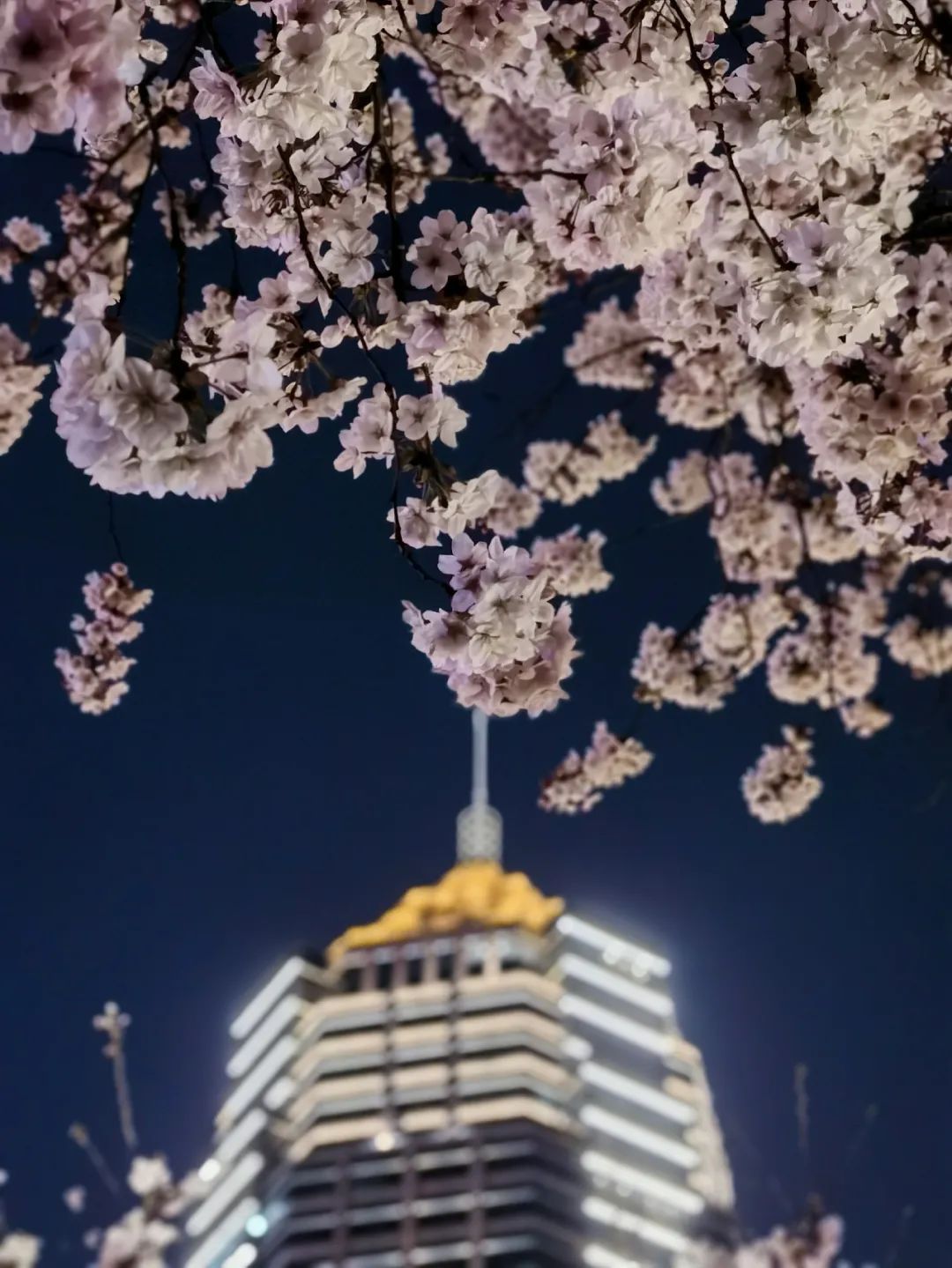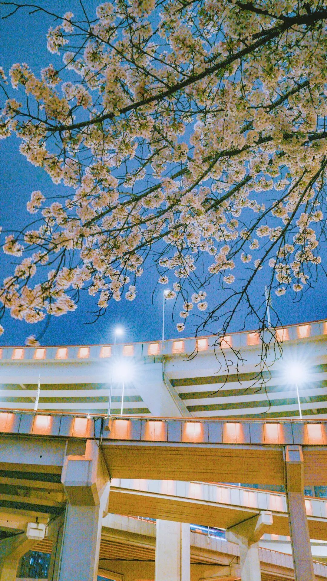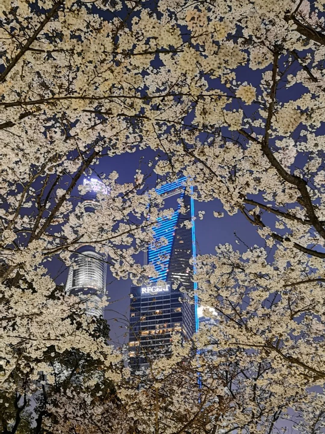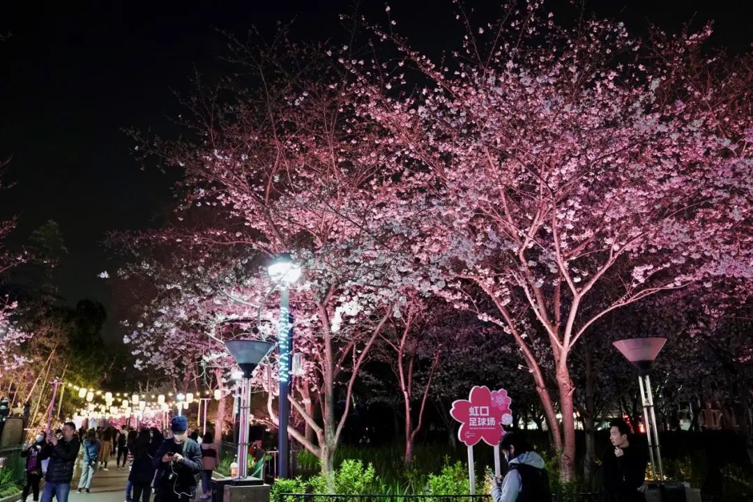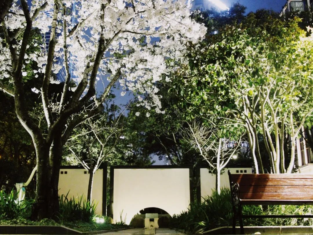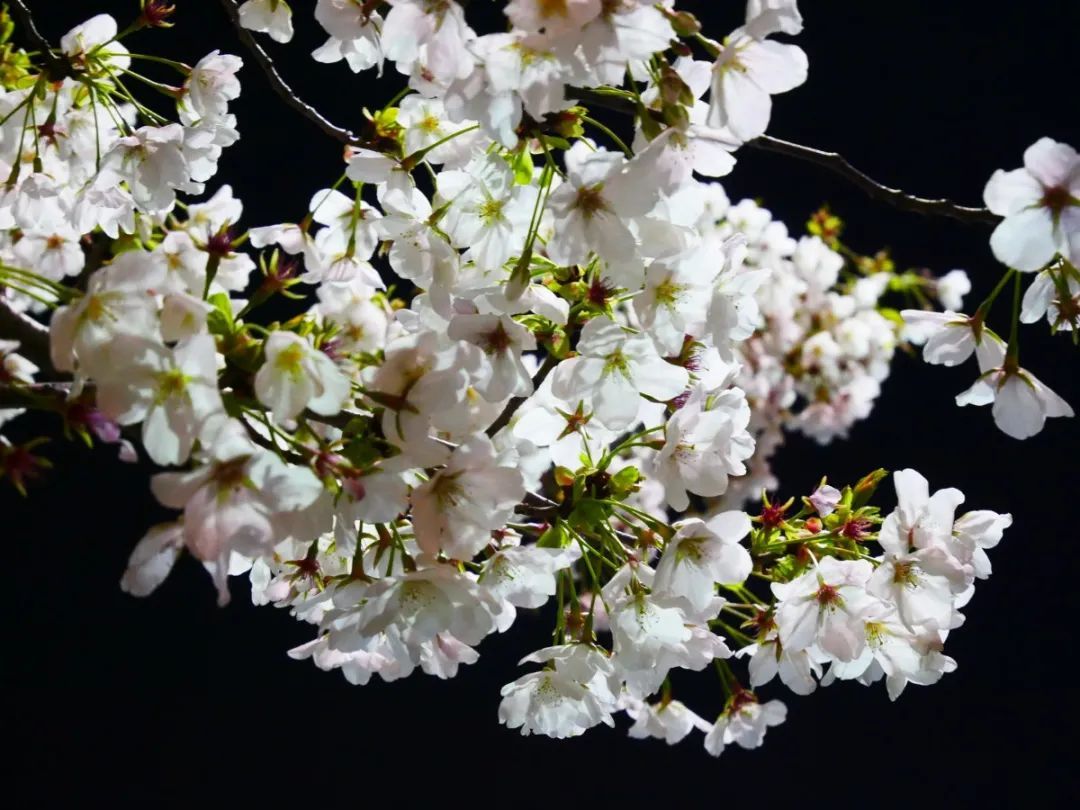 夜如水,樱如雪,看过了阳光下纯白皎洁的樱花,霓虹灯下的夜樱浮现在漆黑的夜空中透出妩媚又别样的姿态,又是另一种绚丽动人。