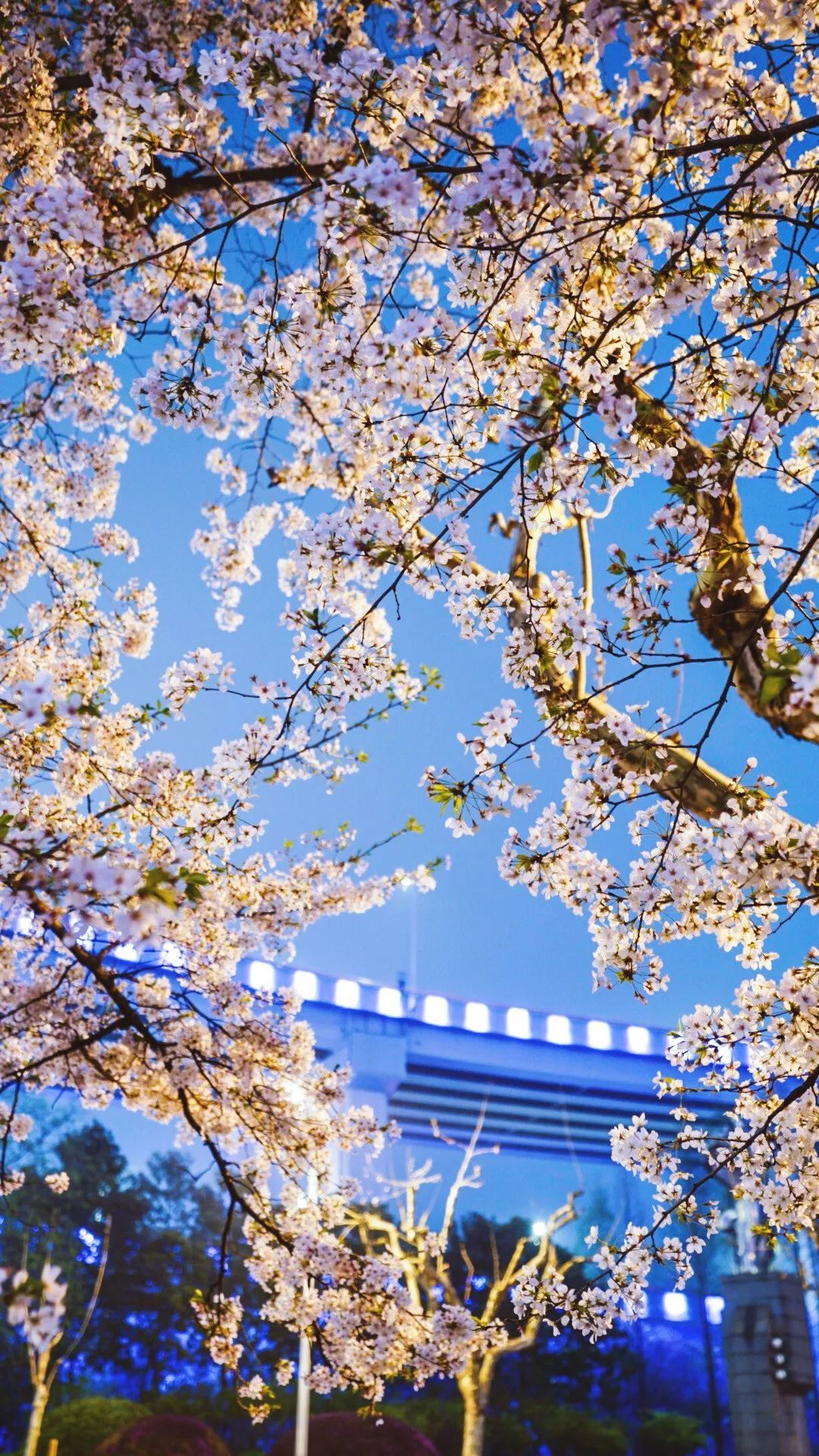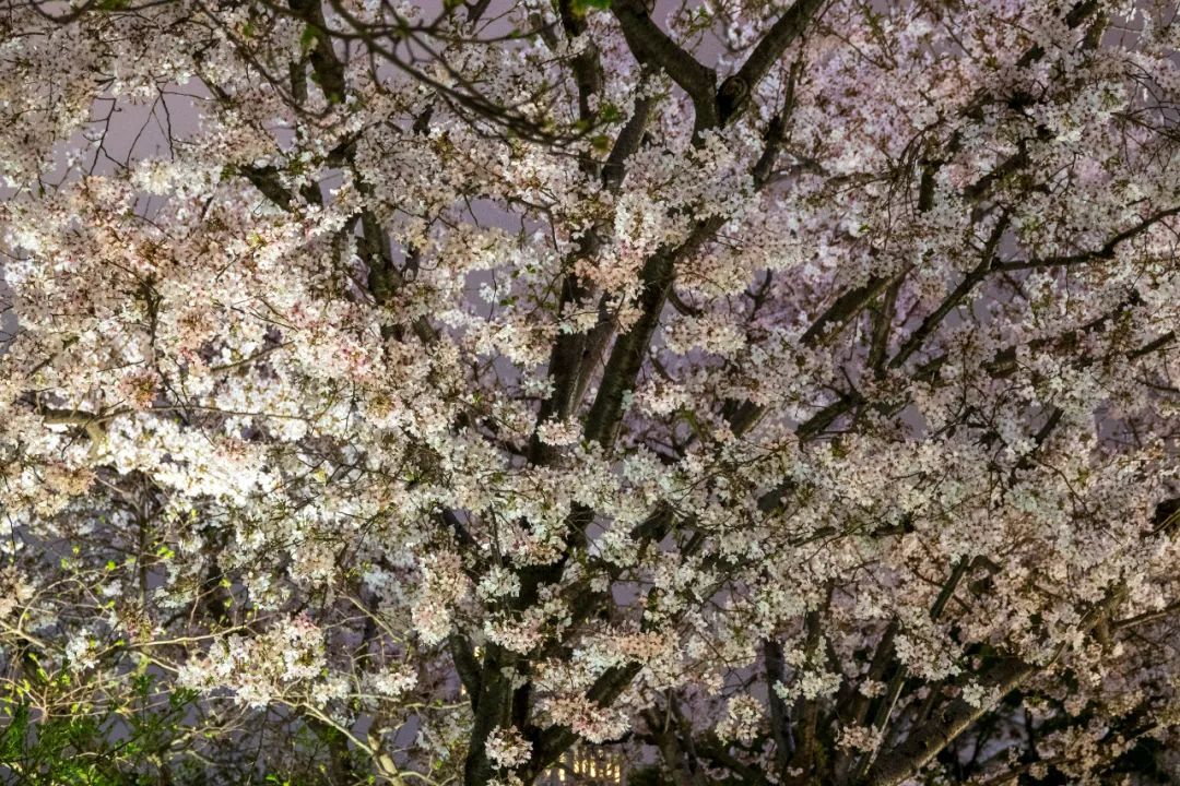由于晚上光线不够充足,选择拍夜樱的时间点便变得尤为重要。三月春季,晚上七点左右为最佳时间,此时拍出的天空会有稍微泛蓝的效果。