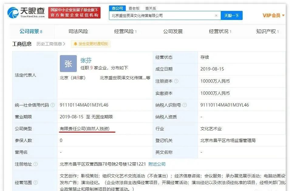 我们检索这家公司的工商注册资料看到,“北京盛世辰泽文化传媒有限公司” 是一家由自然人独资的有限责任公司。