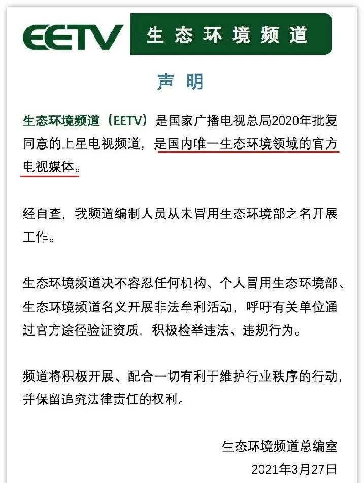 在27 日,“生态环境频道” 对外发布了一份 “声明”,似乎是在回复生态环境部的声明。就在这则声明中,“生态环境频道” 再次将自己称为 “官方电视媒体”。