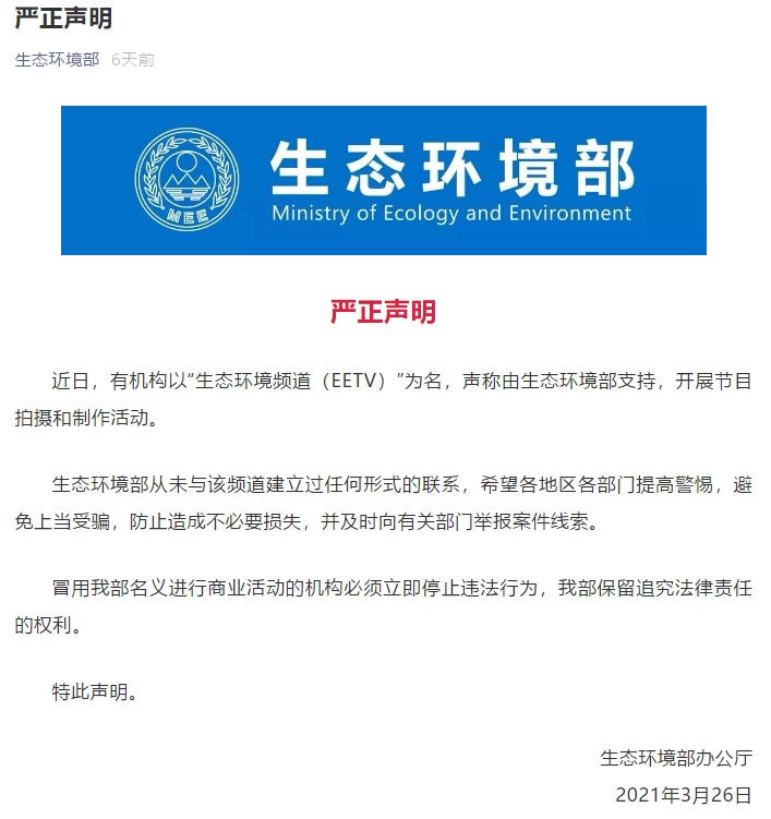 26 日,生态环境部发布声明,声明称,近日有机构以 “生态环境频道 (EETV)” 为名,声称由生态环境部支持,开展节目拍摄和制作活动。生态环境部从未与该频道建立过任何形式的联系,希望各地区各部门提高警惕,避免上当受骗,防止造成不必要损失,并及时向有关部门举报案件线索。
