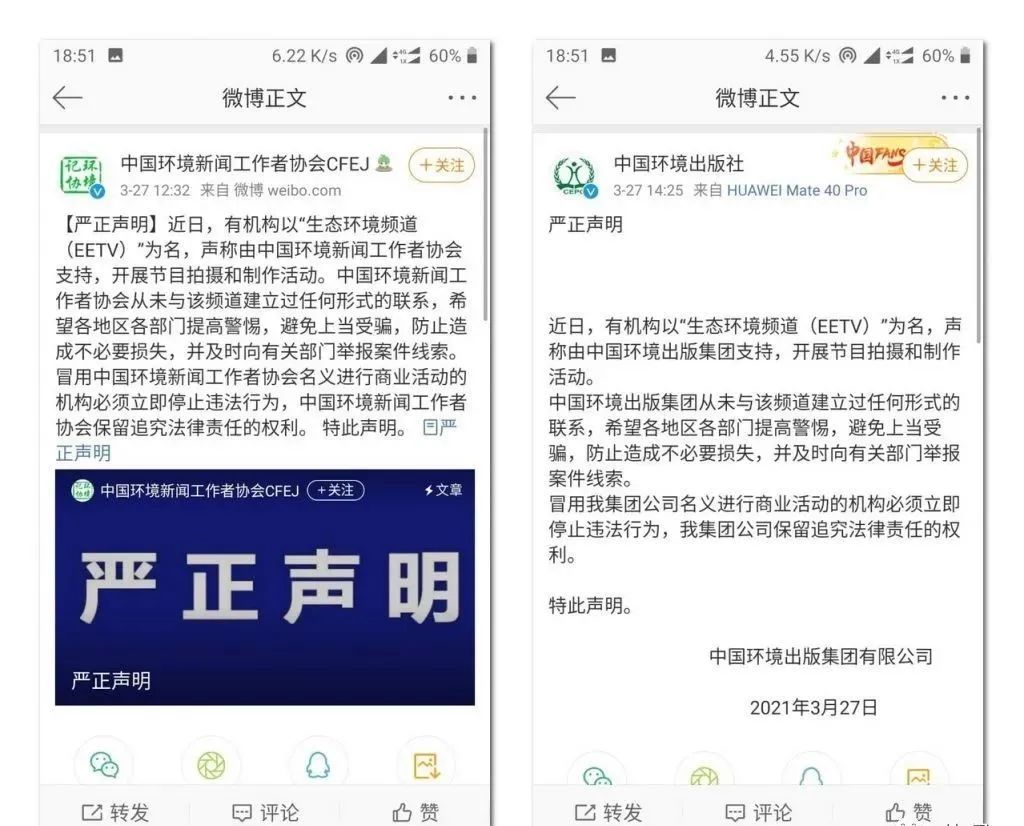 几乎同时,中国环境出版社、环境新闻工作者协会等单位也发布了类似的声明——这些单位的名义似乎也被 “生态环境频道” 冒用了。
