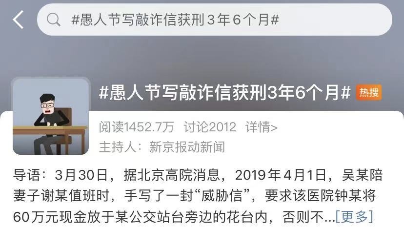 近日,“愚人节写敲诈信获刑3年6个月”一事,引发热议。