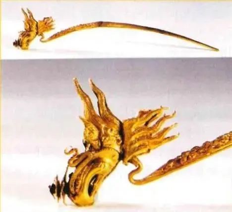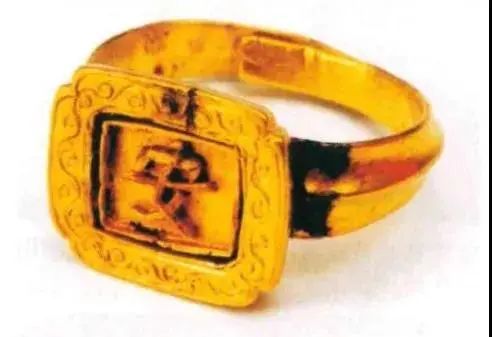 戒指有翻面戒、对戒等。一枚翻面金戒极为罕见,戒心可以来回翻动,戒心一面饰阳文楷书“安”,字,另面錾刻人物纹。一对双龙连珠纹金对戒,两端锤揲錾刻成龙首,两龙昂首张口,似在抢珠,龙睛、龙须雕刻细腻,一丝不苟,出土时分戴在左右手指上,这种配对使用的戒指称为对戒。