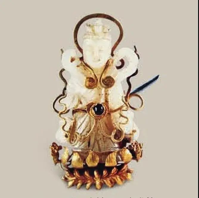 发簪发现最多,质地、形制、纹饰丰富多彩。一件金镶青玉观音簪,观音头顶雕一鸟,胸前嵌红宝石一颗,置身金莲座上。