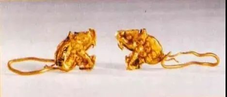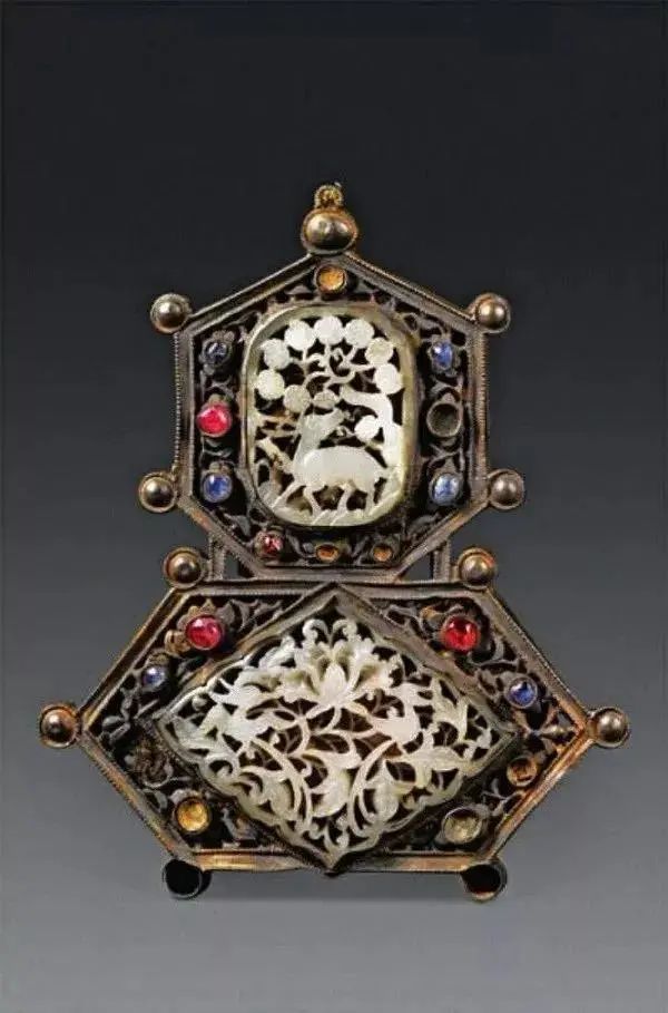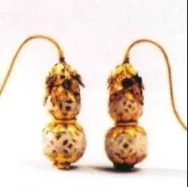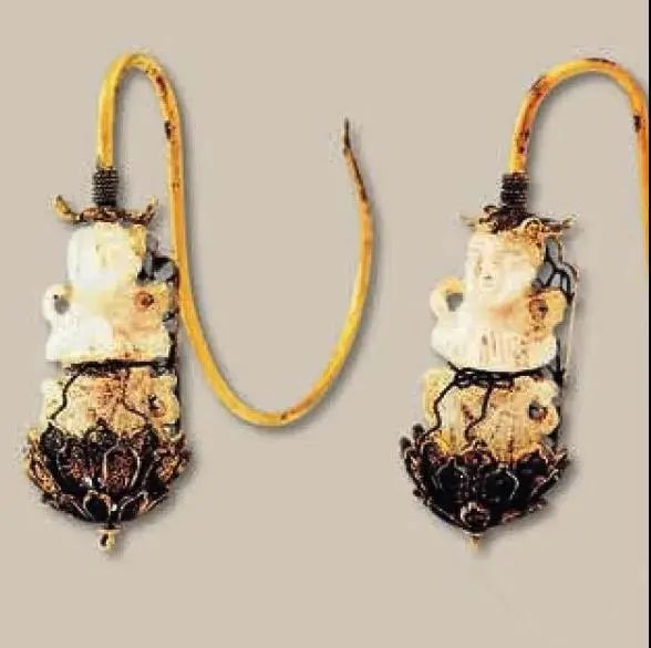 耳坠,最为常见的是葫芦形耳坠,可能同葫芦的谐音“护禄”“福禄”有关,人们认为它可以驱灾避邪,祈祷幸福,使子孙蔓延,人丁兴旺。一件金镶白玉镂孔葫芦耳坠,耳坠上部用一根金丝弯成“S”形,似葫芦蔓,下垂金片锤打镂刻出的双层覆莲瓣,盖在玉葫芦上,似莲盖顶,玉葫芦由大小两颗圆形玉珠组成,玉珠通体透雕镂空钱纹,两葫芦间,为金片制成的仰覆莲瓣,葫芦底部由金片仰莲瓣托起,造型精巧,工艺精湛。另外一件金镶玉莲花童子耳坠极为少见。童子头顶托金片锤揲的花叶宝盖,肩披帛带,腰束带,双手合十,立于盛开的莲花座上。