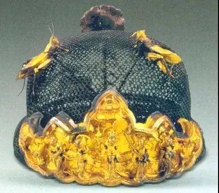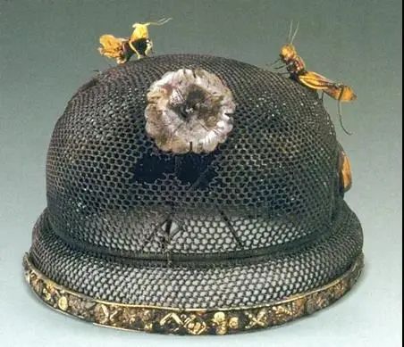 发罩,明代称“荻髻”,是已婚妇女的正装,在家或外出会见亲友时都可以佩戴。李惠利中学明墓发现的一件银丝发罩,采用细如发丝的银丝精工编制而成,孔眼均匀,没有接头破绽。发罩前部边缘插鎏金仙女亭台楼阁簪,后部边缘嵌鎏金人物故事、楼阁、杂宝纹弧状条饰,发罩上插20多件有金鎏金、玉、各色宝石制作的发簪,簪首有鎏金蚂蚱、虾、蝴蝶、菊花、牡丹花、莲花等,珠光宝气。