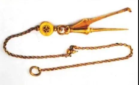 金事件,明代的名称叫“事儿”,有“三事儿”“七事儿”等等。“三事儿”的基本组成是牙签、耳挖和镊子,具有剔牙、挖耳、钳东西三种功能。一件金事件,长链条做成连珠纹,链首套一圆环,链条中部系一金葫芦,一件钱形饰件,钱形饰件下坠一圆环,环内挂一件牙签、一件耳挖。牙签、耳挖由一根圆柱状金条一分为二切割分铸而成,不使用时,合起来为一体,既卫生又便于携带,使用时各自打开。这件金事件上只有牙签和耳挖两种,但将牙签和耳挖合起来可作为镊子使用,是极具巧思的一例。“三事儿”多半是拴在衣巾角上,揣在衣裳袖子里,随身携带。
