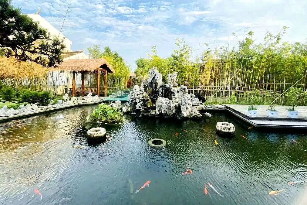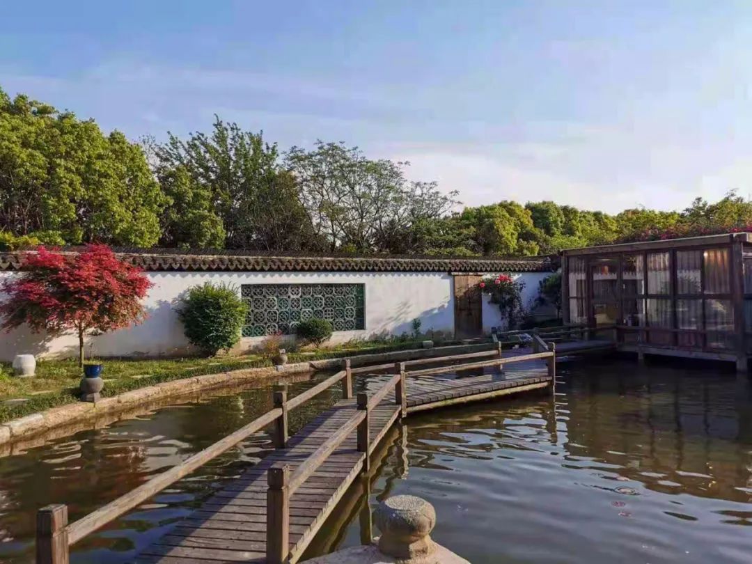 穿过餐厅便是一处小花园,园内种有紫藤、枫树、松树等10多种绿植,园子中央是一片池塘,木制的曲桥蜿蜒其上,供游客赏鱼赏花。