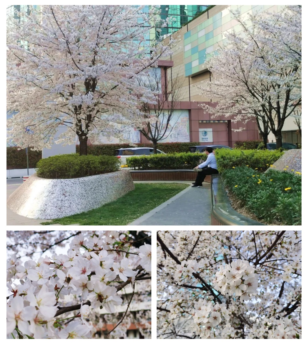 如果你走到商场南区入口处,还能发现一处人少花美的小角落。高大的樱花树旁串联着一条长长的步道,漫步其中仿佛置身一片花海之中。