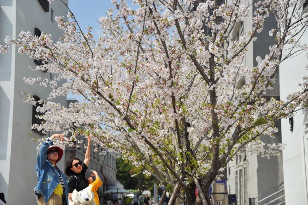 这里的樱花树枝更加细长,花朵颜色偏粉白,如云似雪。一旁老建筑内的餐饮商户设置了露天就餐区,美食美酒配美景,好不惬意。