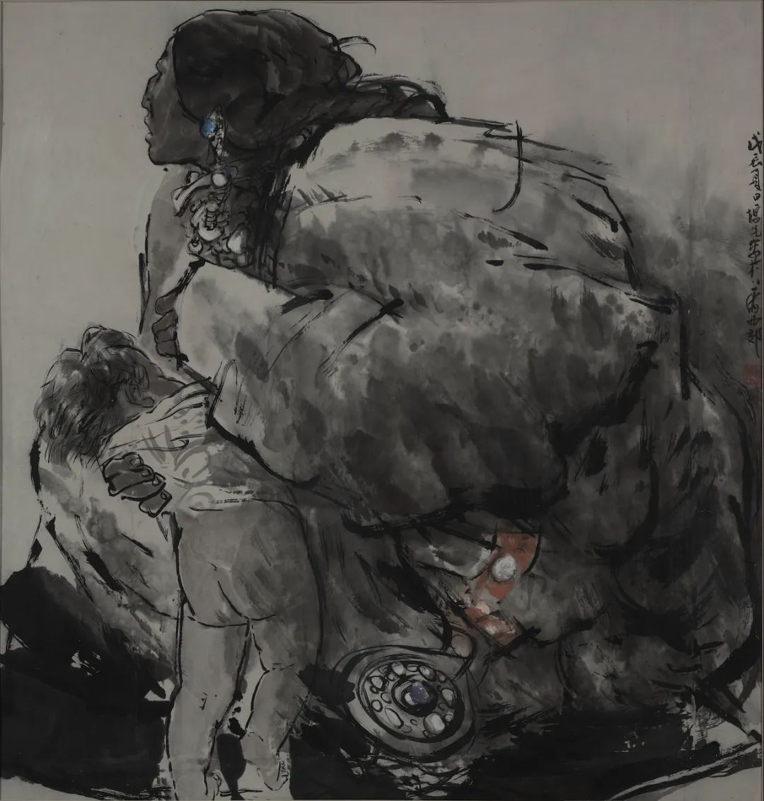 站在这件作品前,可以感受到笔墨自由驰骋而有节制,用笔宽厚极具感染力。这也是画家最著名的作品之一,画中的藏族母亲如山石般雄伟,她抱着小孩向远方眺望,但眼中流露出一些焦虑的神情。
