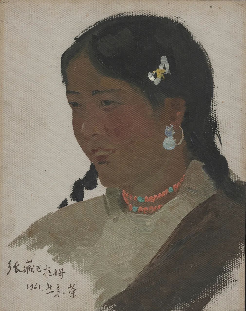 吴冠中的《西藏女乡长》也来自于实地写生,这件绘于1961年的作品,当时42岁的吴冠中与董希文、邵晶坤三人由中国美协组织去西藏写生,当时还创作了油画《扎什伦布寺》、《拉萨龙王潭》、《罗布林卡》、《西藏佛壁》等风景作品。《西藏女乡长》是吴冠中存世不多的纸上半身人像之一,画中人皮肤黝黑,微笑质朴而亲切,画家弱化立体感,采取了相对平面化的造型,这也是吴冠中探索东西方绘画两种艺术语言的不同美学观念,以及“油画民族化”“中国画现代化”的实践。