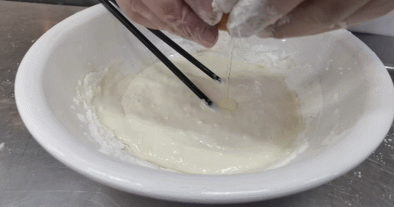 2.在面粉调匀的过程中,分别加水、加鸡蛋、加入冷的清油,调匀到面糊可以沿着筷子缓慢往下流 。