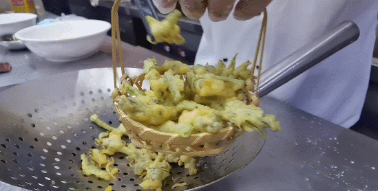 3.将裹上面糊的春椿依次下油锅,油温升至六成时,第一次过油,炸至嫩黄,捞出,让面粉醒发一下,去除油锅中的杂质。