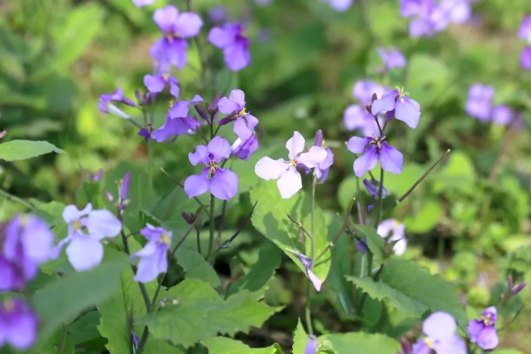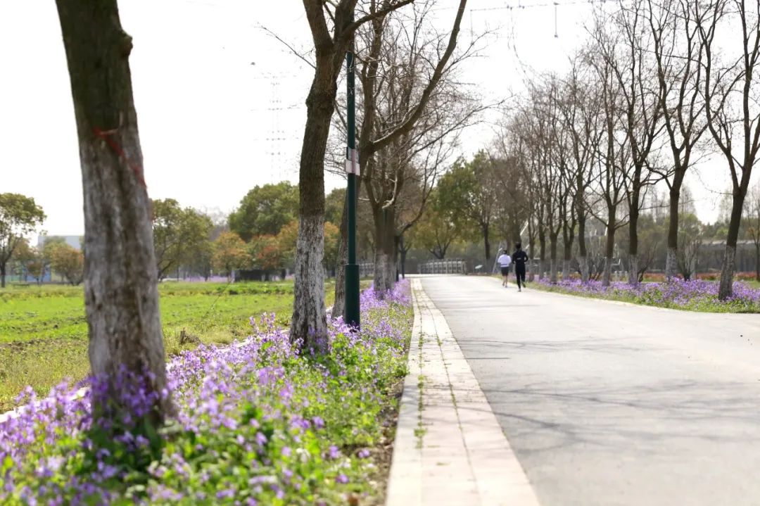 在嘉北郊野公园,连片的二月兰花开正盛,白紫相间的花瓣随风摆动,映衬着绿叶和青草,仿佛一片紫色的海洋。