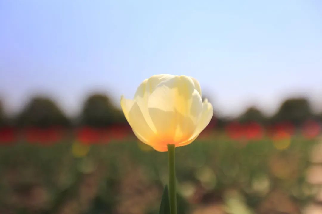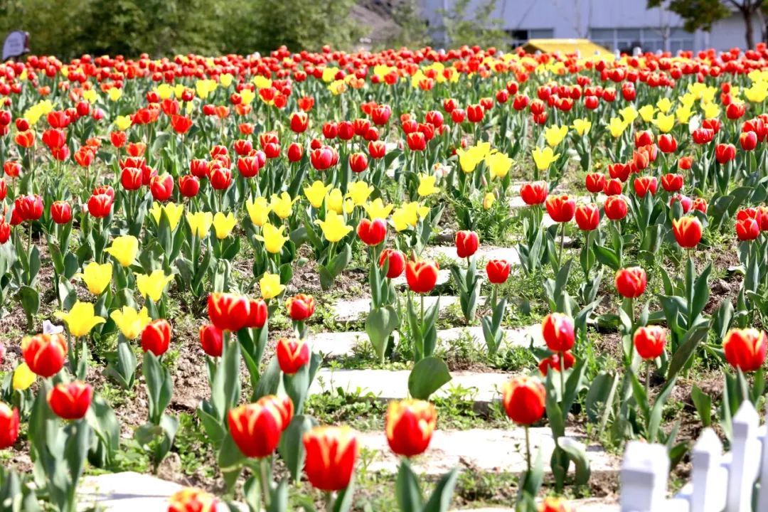 这是一片在厂区内的郁金香花海,黄色、红的、粉的,数量有近万株,品种和颜色层次都相当丰富。