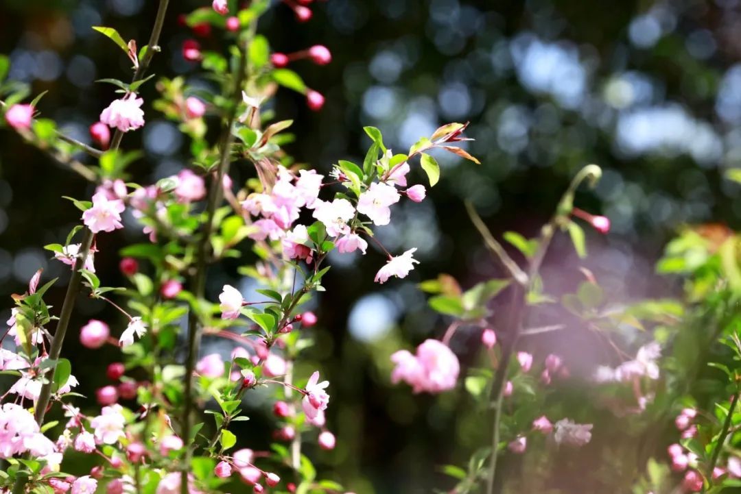 沿着百安公路恒谐路路口往北,可以看到路边种植的一排垂丝海棠正在吐艳,远远望去如云似雪,层层叠叠。据了解,垂丝海棠在开花过程中,颜色会发生由浓至淡的渐变,所以整株花树会看起来更加妖娆多姿。