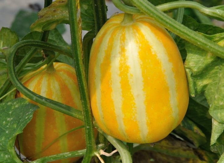 瓜形美观,果实长卵形,果皮金黄色且有10条白色纵条,故也称为“十条筋黄金瓜”。瓜透熟后香气芬芳浓郁,皮薄肉嫩,果肉白色,口感甜糯。