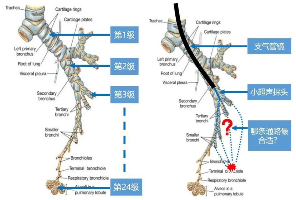 普通支气管镜由于直径限制,直视下只能到达第2级叶支气管,因此常用与中央型病灶的诊疗。虽然细支气管镜结合小超声探头能够突破技术瓶颈进入到第5、6级甚至更远的细支气管,但寻找通往病灶最合适的通路一直是费时费力的工程。