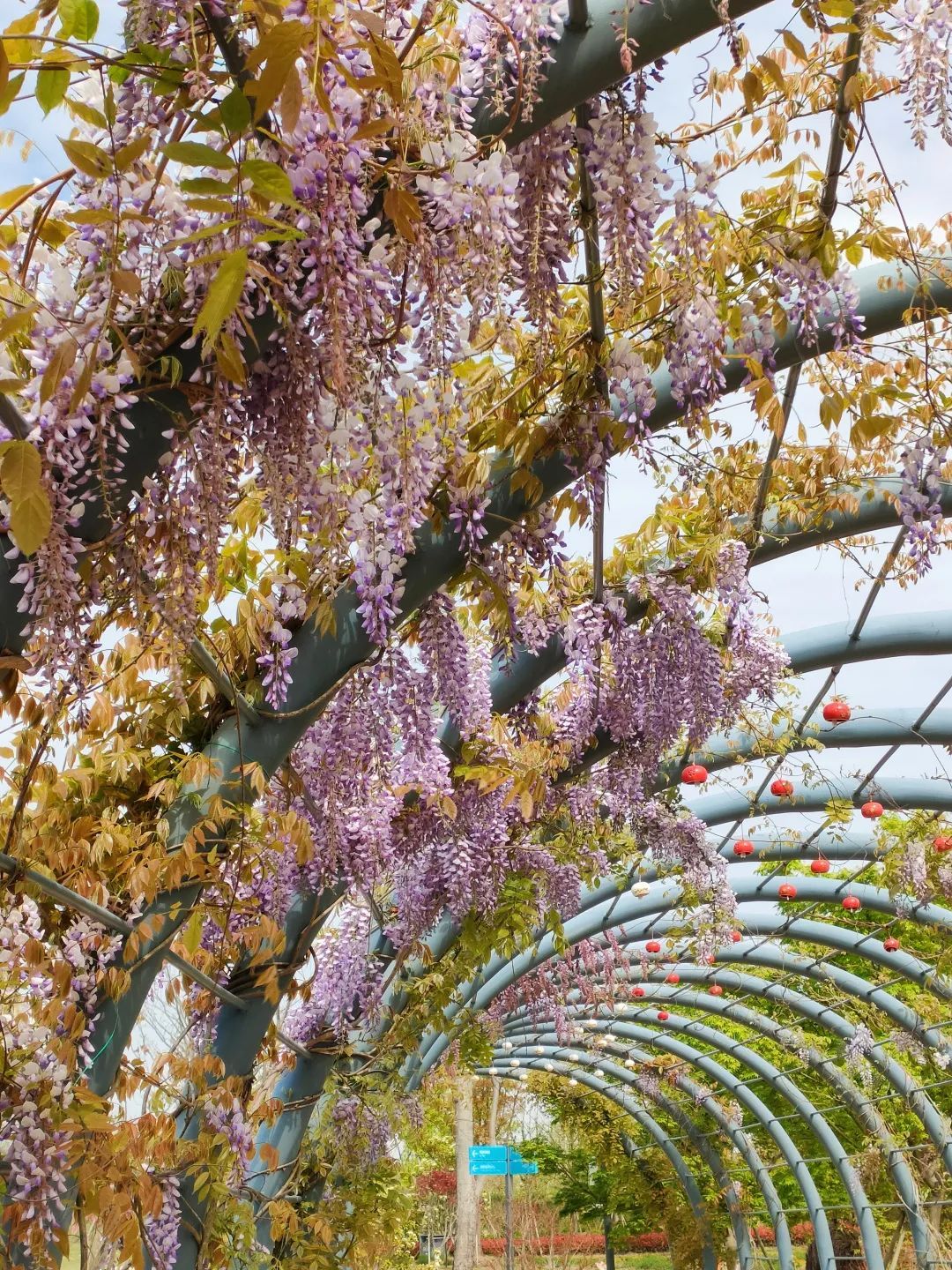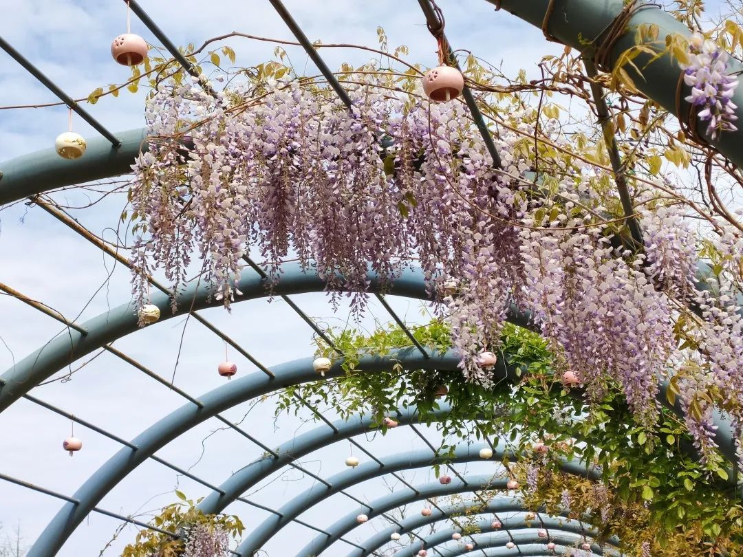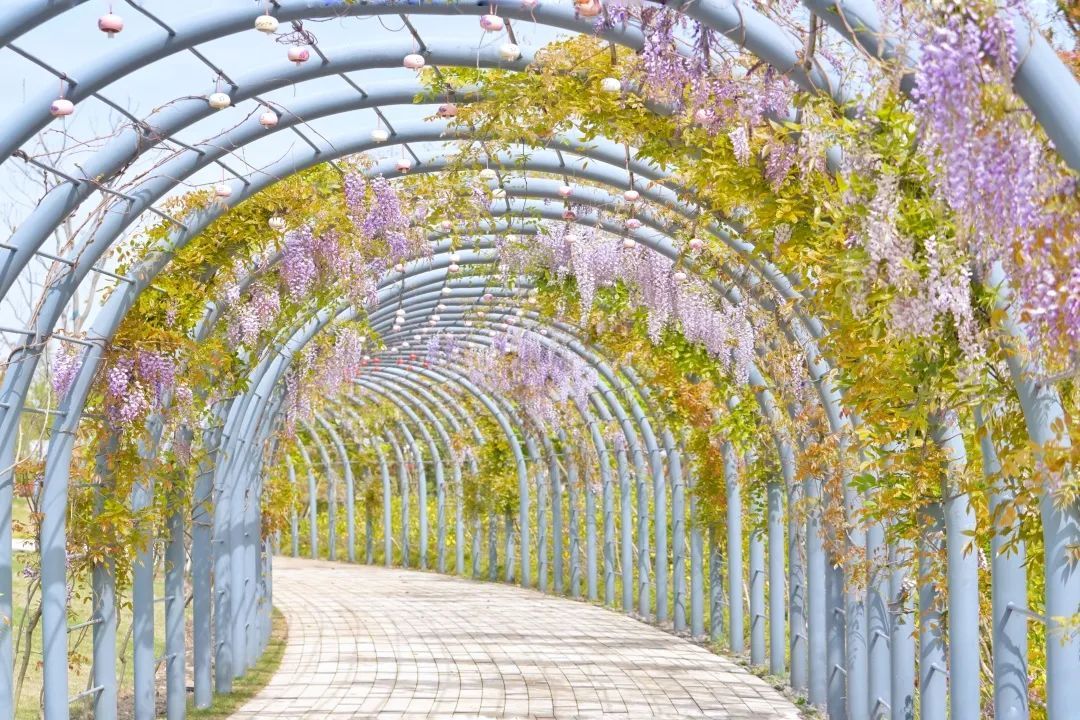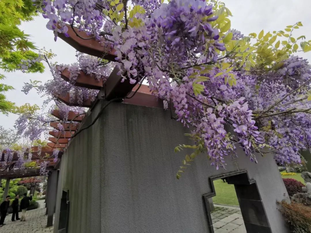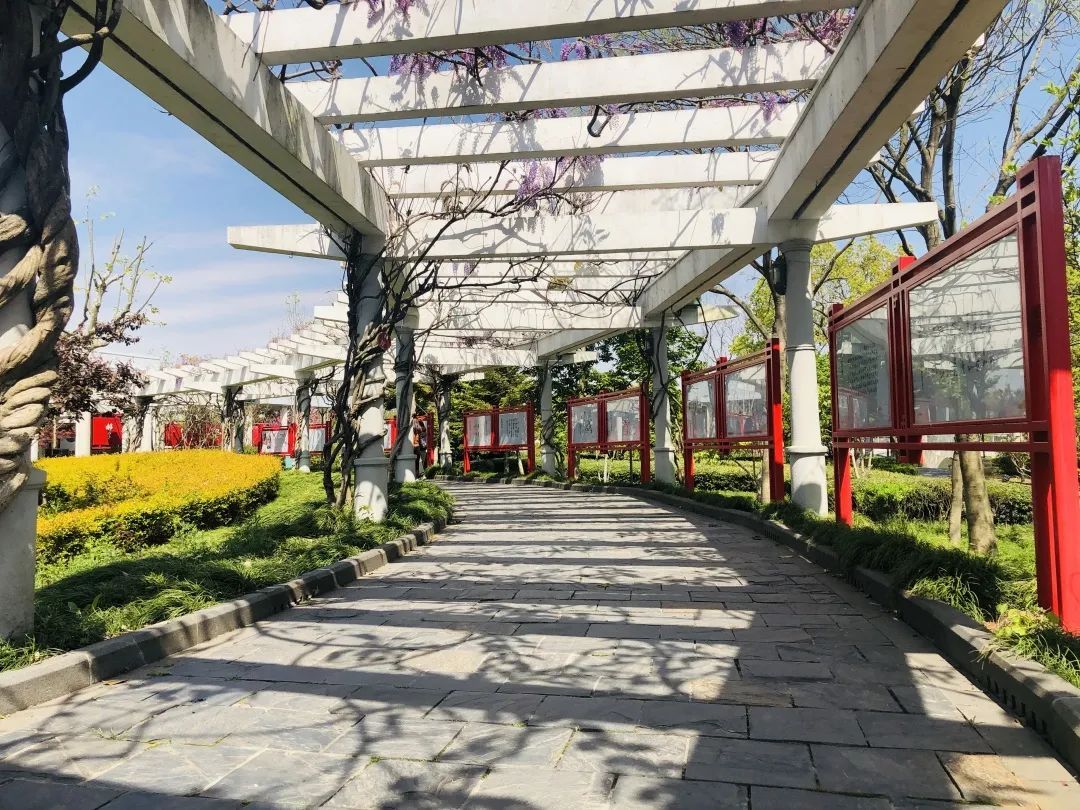 四季生态园内的贤文化长廊上紫藤花也已含苞待放,这里可以感受红色奉贤的可歌可泣,也可以欣赏72种不同字体的“贤”字与紫藤花交相辉映。