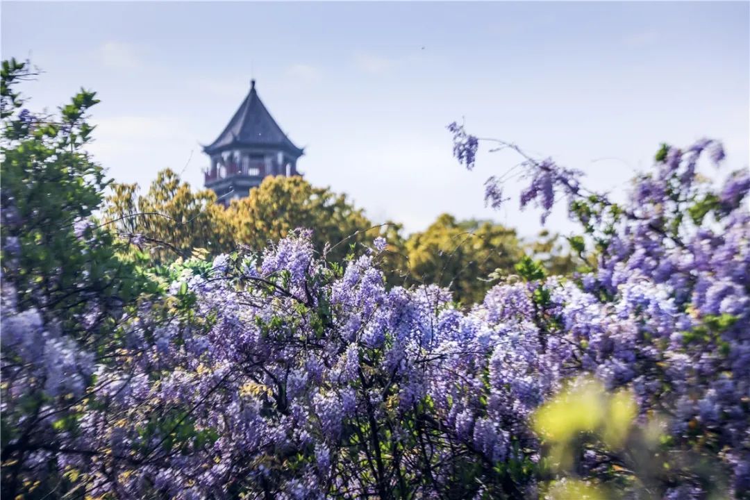 望春园虽小,但小亭、曲桥、长廊、假山、荷池一样不少。粗壮的枝条弯曲缠绕,漂亮的紫藤花浪漫无比。