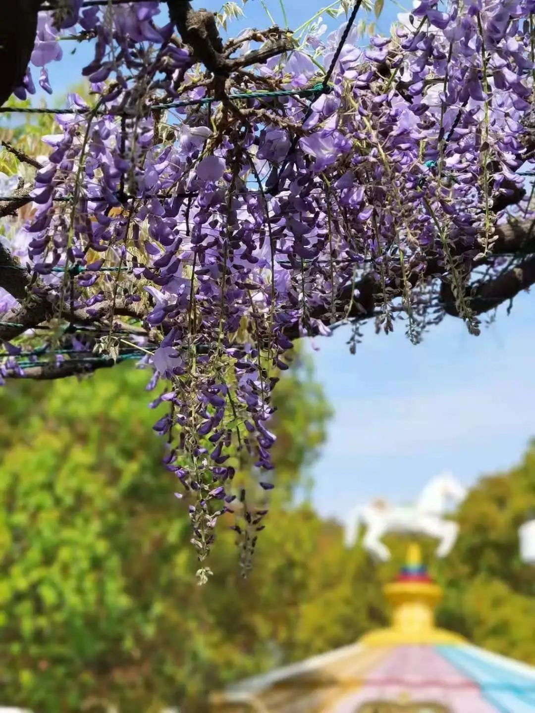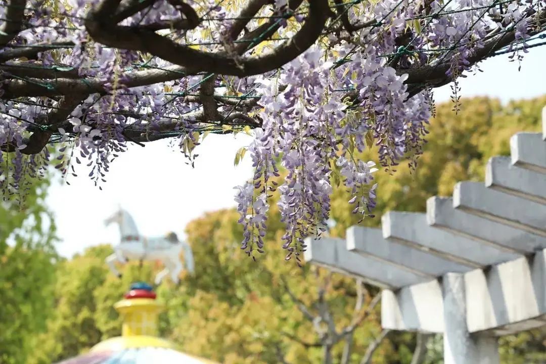 要说最有趣的紫藤园,那一定是在古华公园内。在儿童游乐场,中心的售票处和围着一圈的休闲廊架间,挂满了紫藤花,讲述着它和旋转木马之间的梦幻童话故事。