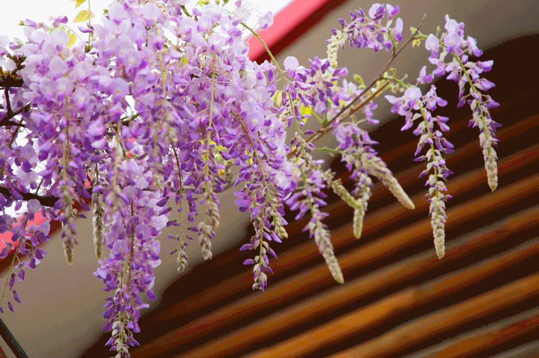 紫藤:豆科紫藤属落叶木质藤本植物。茎的旋转方向为左手性,即逆时针旋转。先花后叶,总状花序由前一年短枝的腋芽或顶芽生出,花序轴上覆盖着柔软的白毛,花紫色,芳香,具蝶形花冠,旗瓣先端凹陷,花开后反折。一串串硕大的紫色花穗悬挂在藤架之上,犹如紫色的风铃随风飘荡。