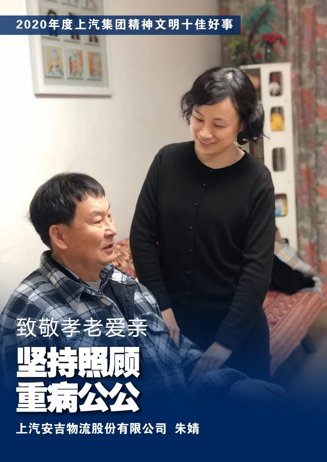 由于脊椎受损,朱婧的公公卧床四年。作为儿媳,朱婧在四年间坚持为老人做理疗康复,并鼓励公公进行康复运动。小到剃须刀,大到康复训练器具都由她精心挑选。为了给公公解闷,她还教会了公公在家网购。公公大小便失禁时,朱婧也不嫌脏,帮着婆婆给公公做好细致、繁琐的护理。