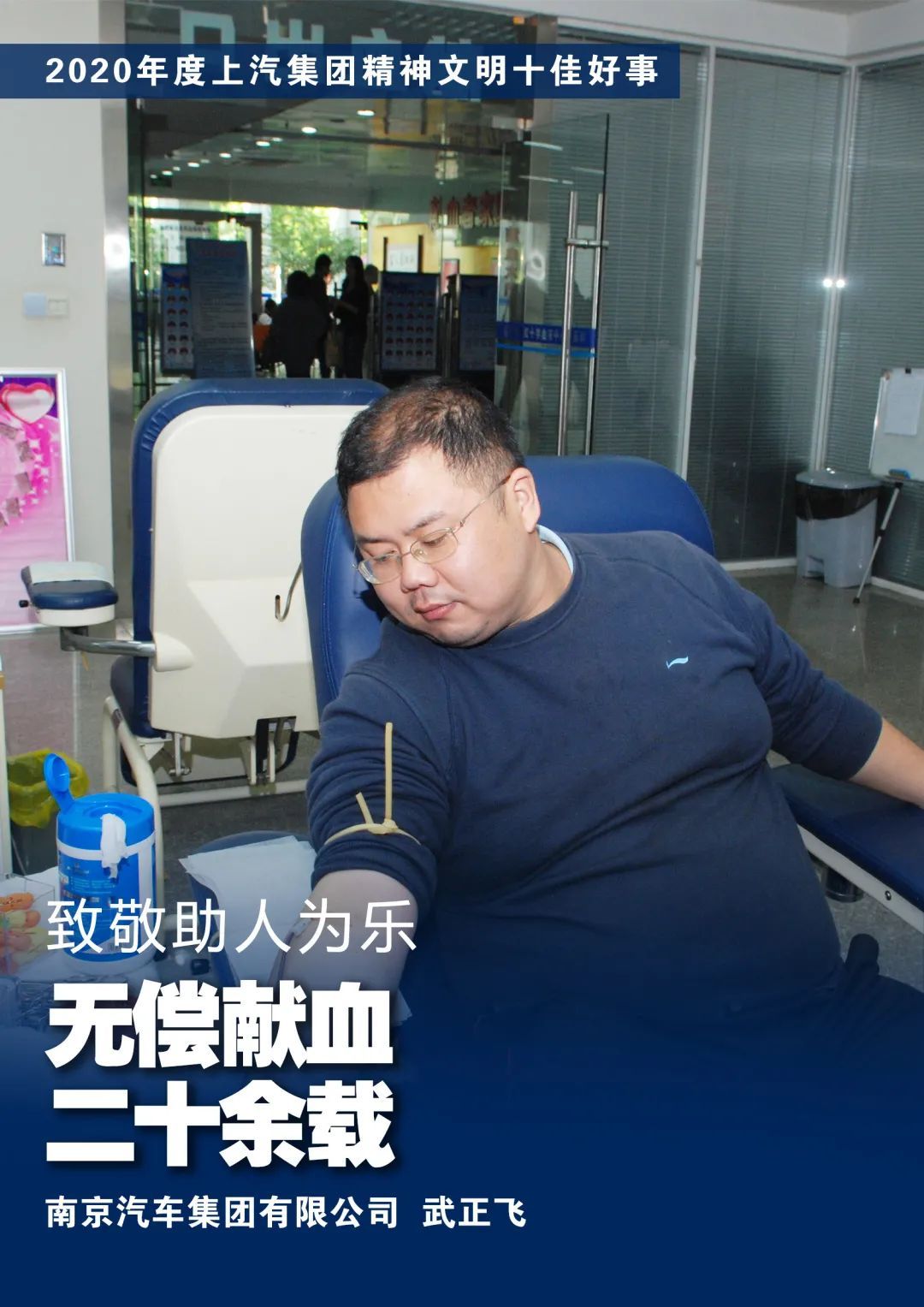 武正飞是南汽集团动能分公司的一名员工,他一直积极响应社会公益事业的号召。1998年,还是名学生的他第一次无偿献血。