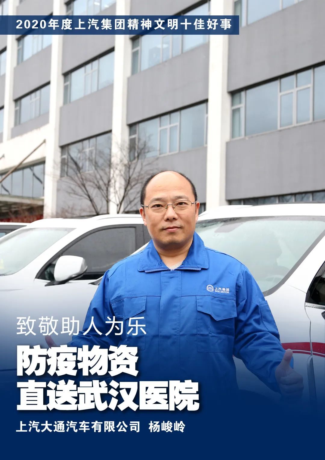 2020年,上汽大通员工杨峻岭组织了近100人的志愿者团队,利用在海外工作时的经验和资源,在全球范围内募集抗疫物资支援武汉。最终,有6万只口罩和4万套防护服,从澳大利亚送达武汉的医院。杨峻岭在关键时刻,展现出无私的奉献精神和不畏艰险的责任担当。