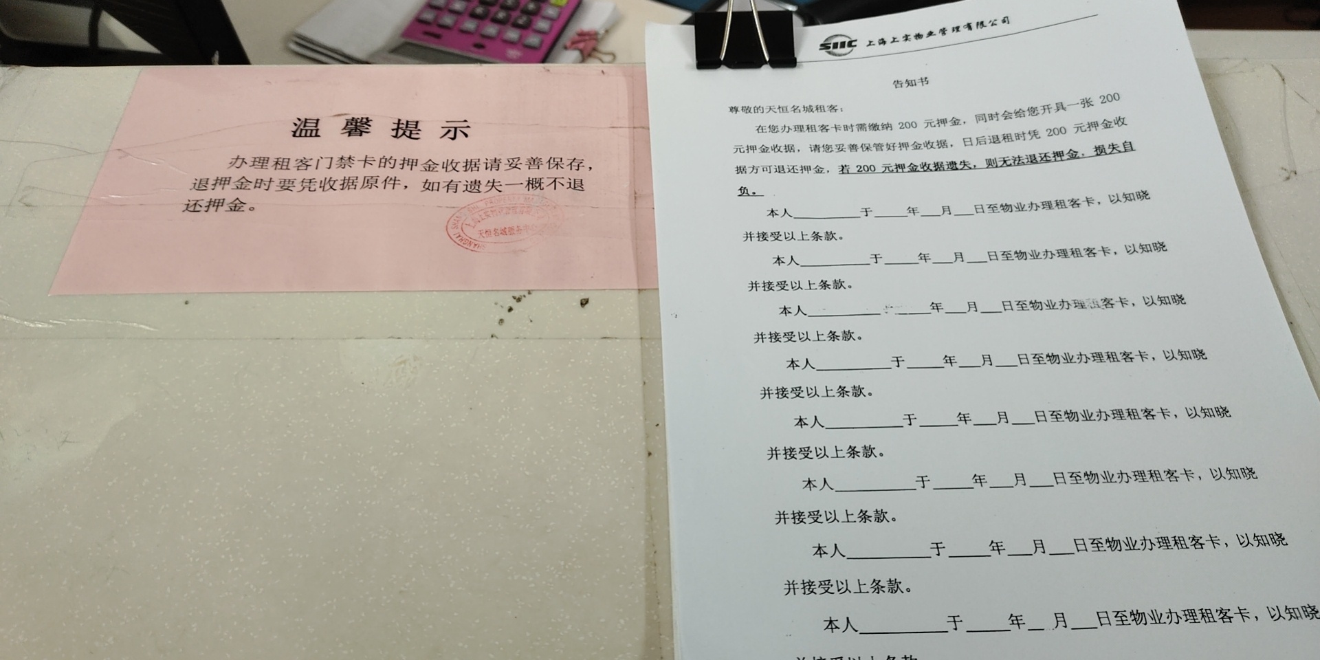 近日,贡女士向节目组来电反映,自己租住在闵行区鑫都路2688号天恒名城小区期间,在物业办理了门禁卡,支付200元押金和25元购卡费。退租时,贡女士由于押金凭证遗失,物业以此为由拒绝退还押金。