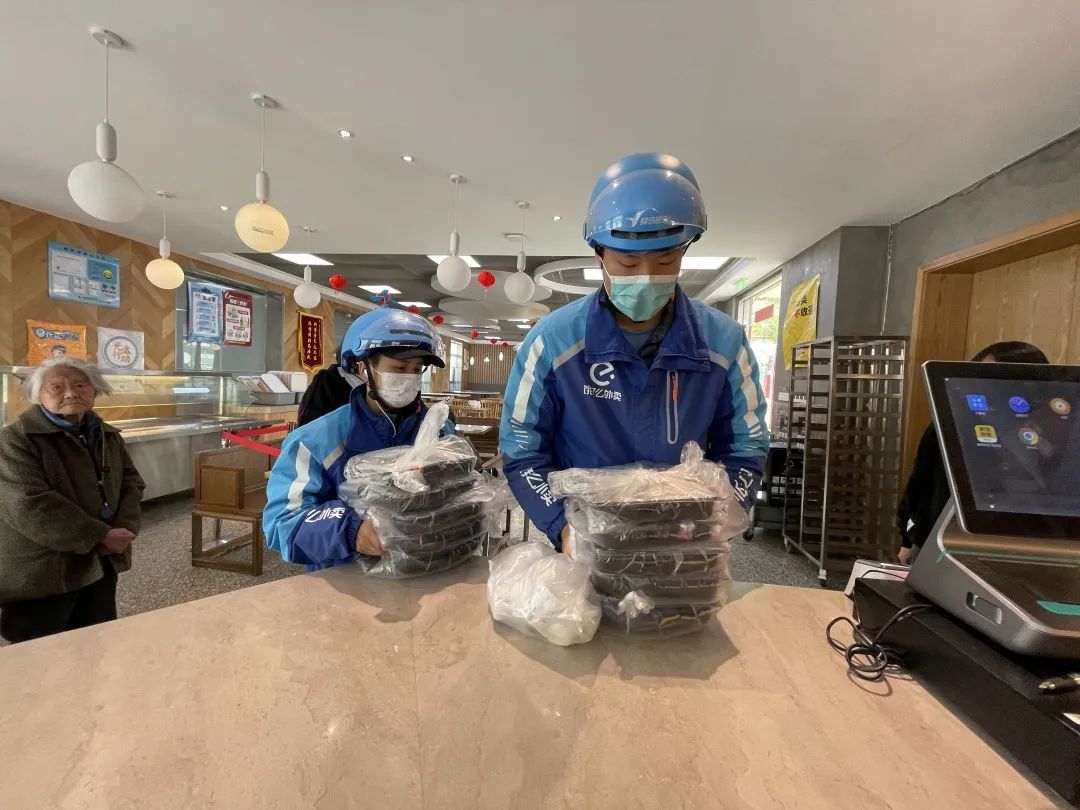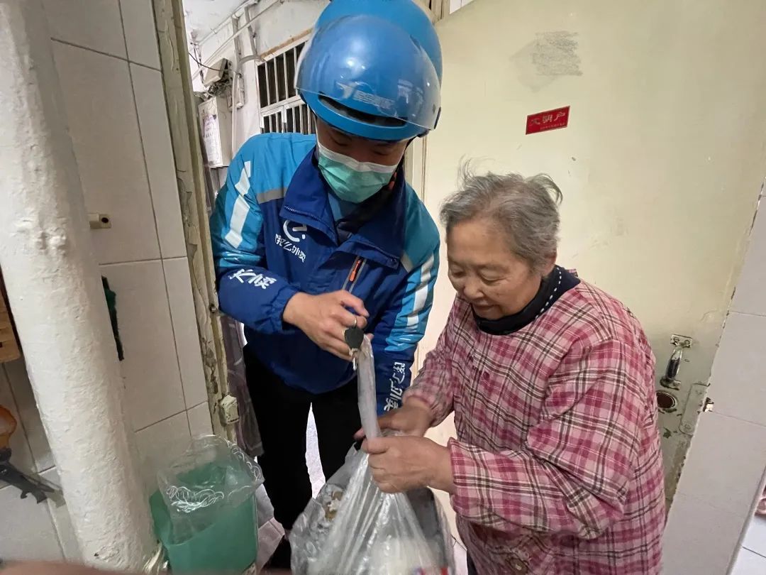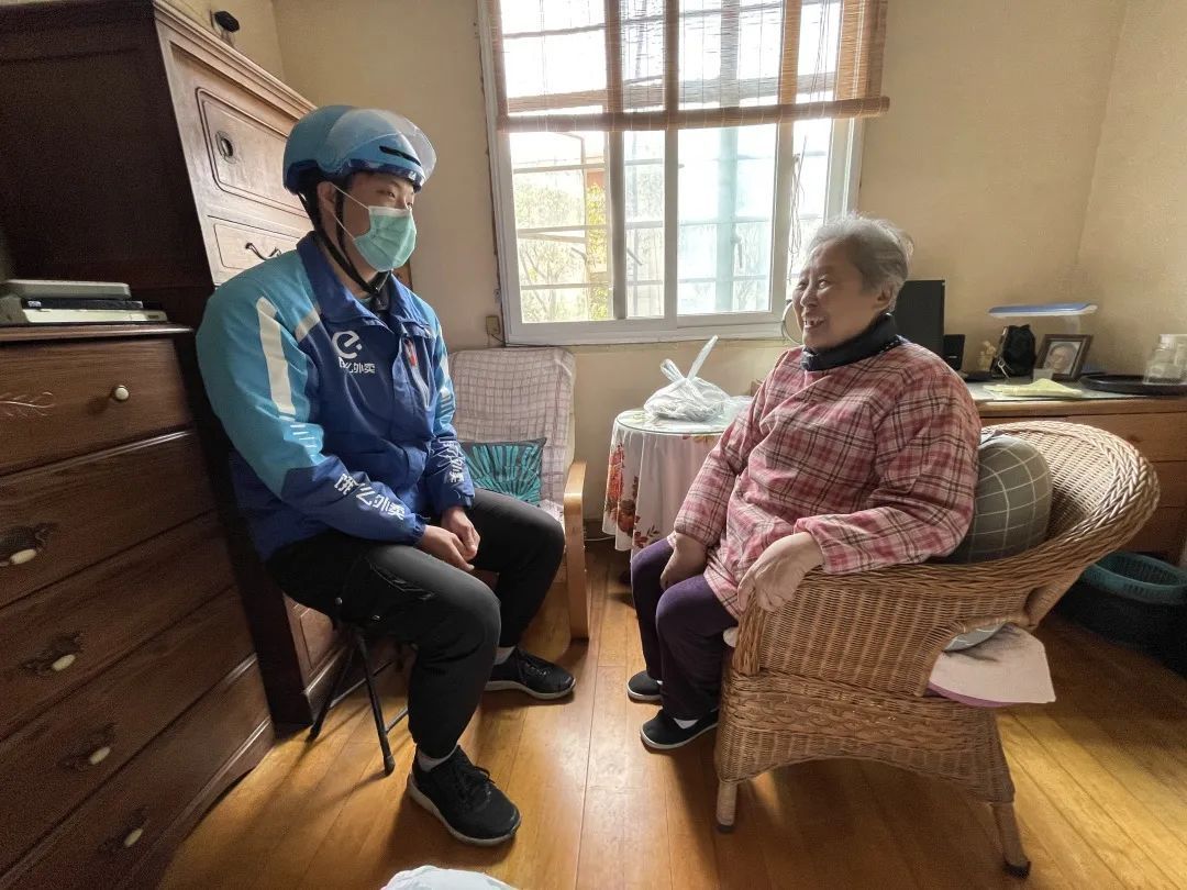 “奶奶你好,我又来送餐啦。”10点45分,家住风荷苑的83岁独居老人吴芸迎来了一阵叫门声,为她送餐的是98年出生的蓝骑士董江智,这已经是小董连续第8天为吴奶奶送餐了,奶奶又一次热情招呼他进屋坐下。在奶奶眼里,小董是个又高又帅的小飞人,上下楼跑得飞快,平时还不时询问自己能否帮忙做些事。在小董印象中,吴奶奶像自己外婆一般和蔼,看着奶奶健健康康自己就很开心。小董告诉记者,自己平时与外公外婆生活在一起,深知他们特别喜欢与小一辈沟通交流,于是主动向平台报名成为一名爱心送餐员。为此,每天早上10点30分,小董都会准时来到长者食堂取餐,然后将吴奶奶家“调整”为当天送餐的最后一站,以便多聊几句。为此,他还将公司规定的“你好,饿了么蓝骑士”开场白改成了“奶奶(爷爷)你好,我们又来送餐啦”,“因为跟爷爷奶奶不是外人,所以原来的话术会让人产生陌生感,现在这样就像自家人一样。”每天,董江智为爷爷奶奶送餐时都将个人接单状态改为离线,与老人分别后再重新上线接单。即便聊天可能会错失一部分的高峰订单收入,但他觉得,这一刻自己能够收获比金钱更多的东西。