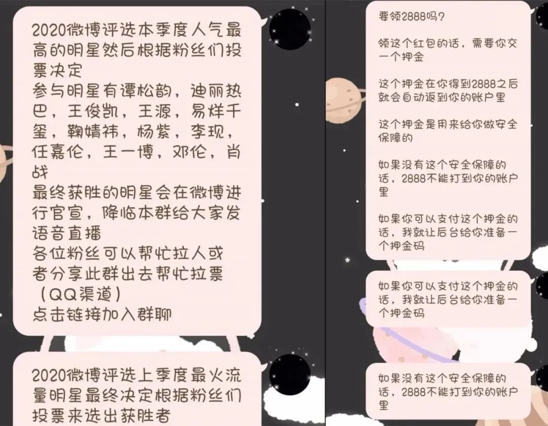 2020年1月24日,浙江绍兴嵊州市在校学生小张在家长的陪同下到公安机关报警,称其在家中上网的时候被QQ网友以“评选2020年最火流量明星”为由,拉入一个QQ群中。入群后,就有人开始发明星返利粉丝的信息,声称“充100返200”“充200返688”等。缺少社会经验的小张信以为真,添加了对方QQ号私聊后,一笔、两笔、三笔……竟然陆续向对方转了十几万元。