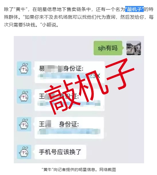 由于一些粉丝群里明星的个人信息被明码标价贩卖,粉丝为了追星时坐在偶像旁边,就拿着购买的明星身份证、航班号等信息帮明星办理值机手续。
