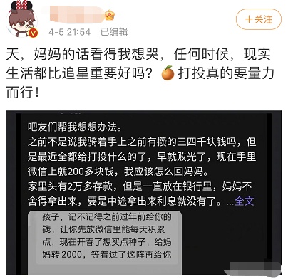 ▲4月5日,一个求助帖引起网友讨论,原因是一个家里只有2万多存款的孩子却拿了三四千块去参加饭圈打投。