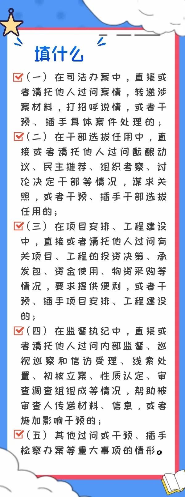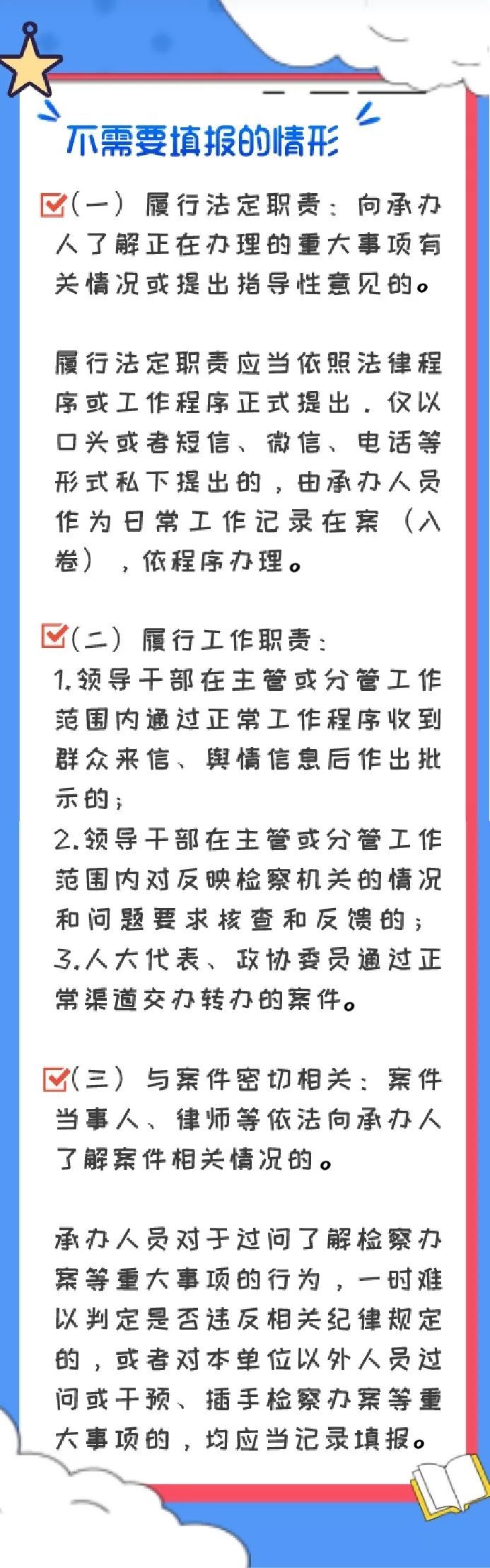 这个也不行哦!最高检在《关于建立过问或干预、插手检察办案等重大事项记录报告制度的实施办法》中作了明确规定,确定了在哪些情况下,哪些人对哪些行为需要填什么?怎么填?哪些情况不用填?