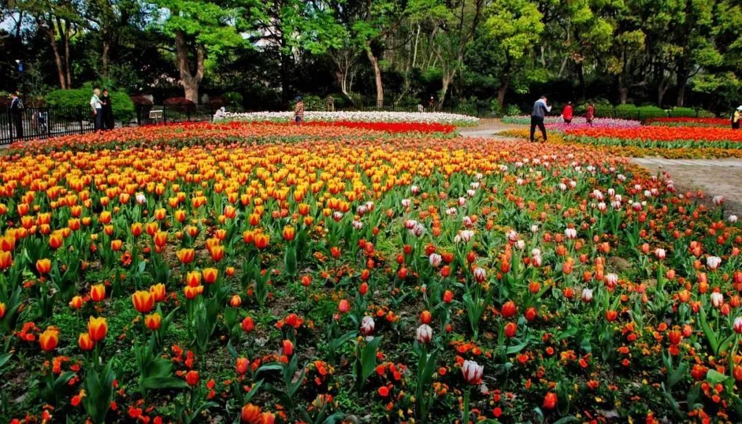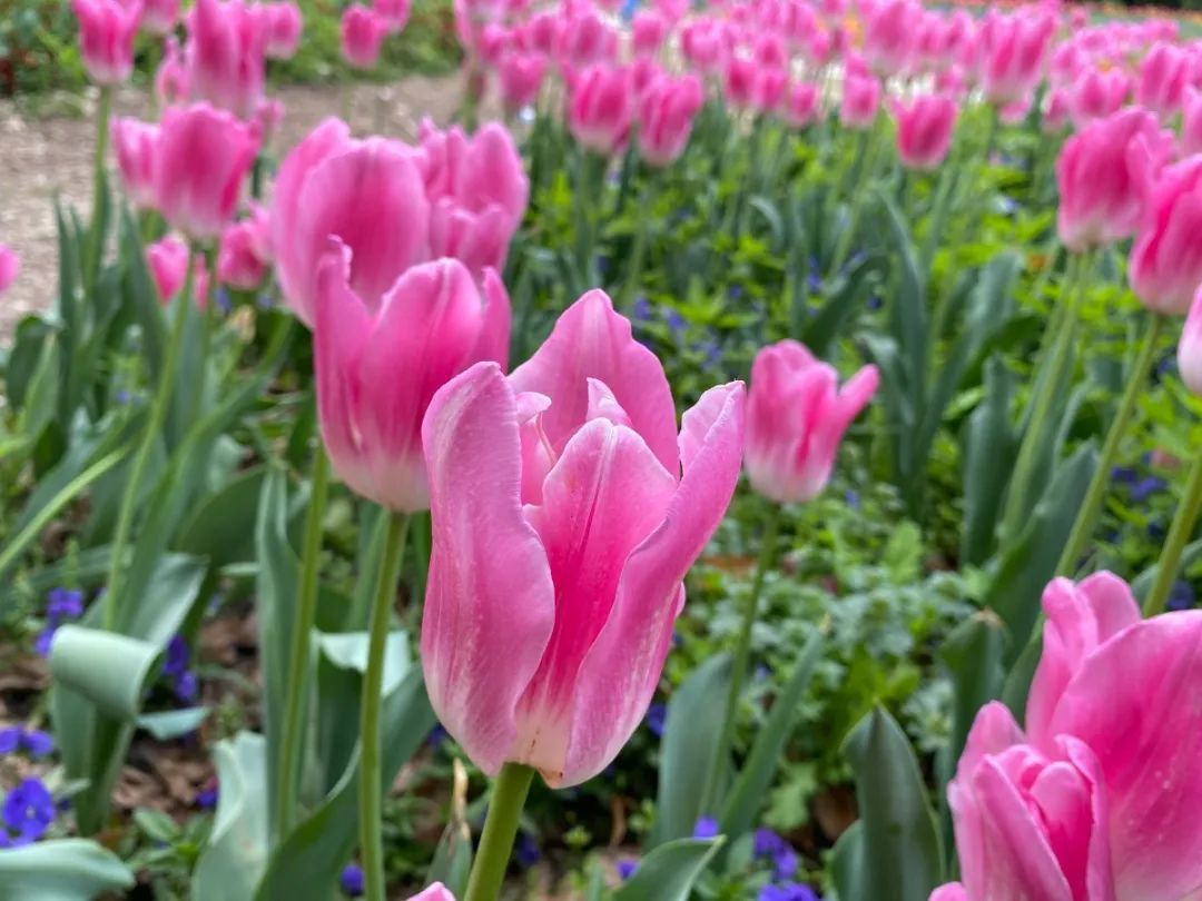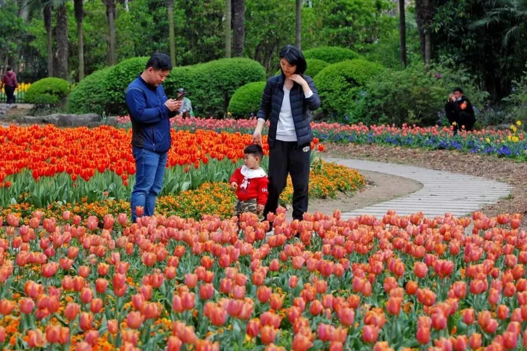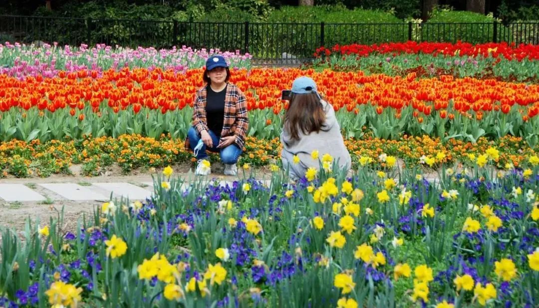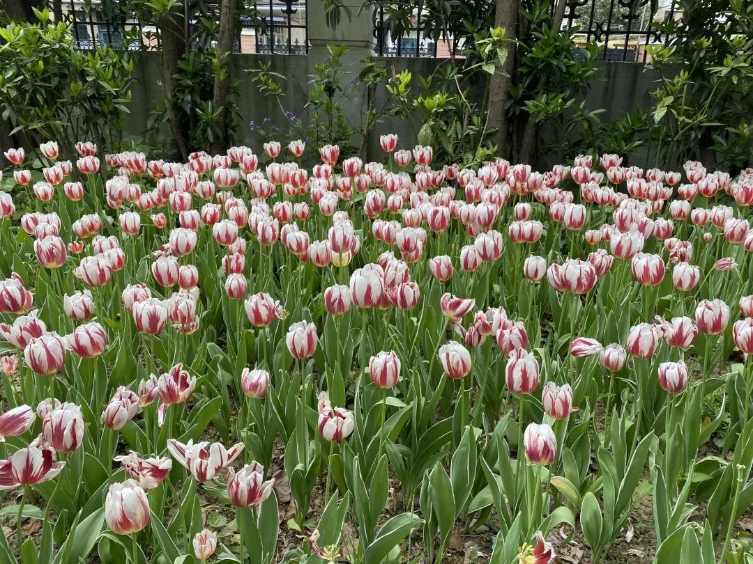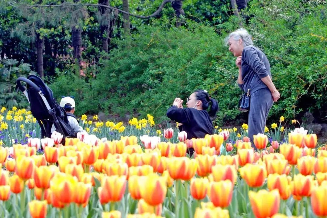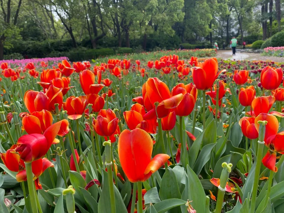 黄的、粉的、白的,金的,各色郁金香在杨浦公园的花田里徐徐绽放。