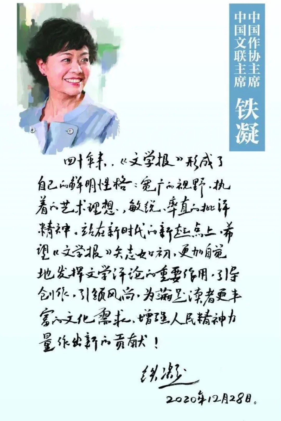 中国作协主席铁凝向《文学报》创刊40周年致以寄语。铁凝说,40年来,《文学报》形成了自己的鲜明性格:宽广的视野,执着的艺术理想,敏锐、率真的批评精神。站在新时代的新起点上,希望《文学报》矢志如初,更加自觉地发挥文学评论的重要作用,引导创作,引领风尚,为满足读者更丰富的文化需求,增强人民精神力量作出新的贡献。