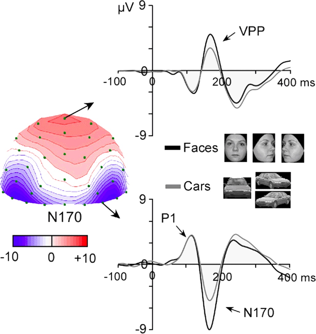 进一步的研究发现,不仅仅是真实的人脸,即使是卡通人脸,表情包,甚至是在圈内的两个点和一条线,都会诱发 N170 产生。
