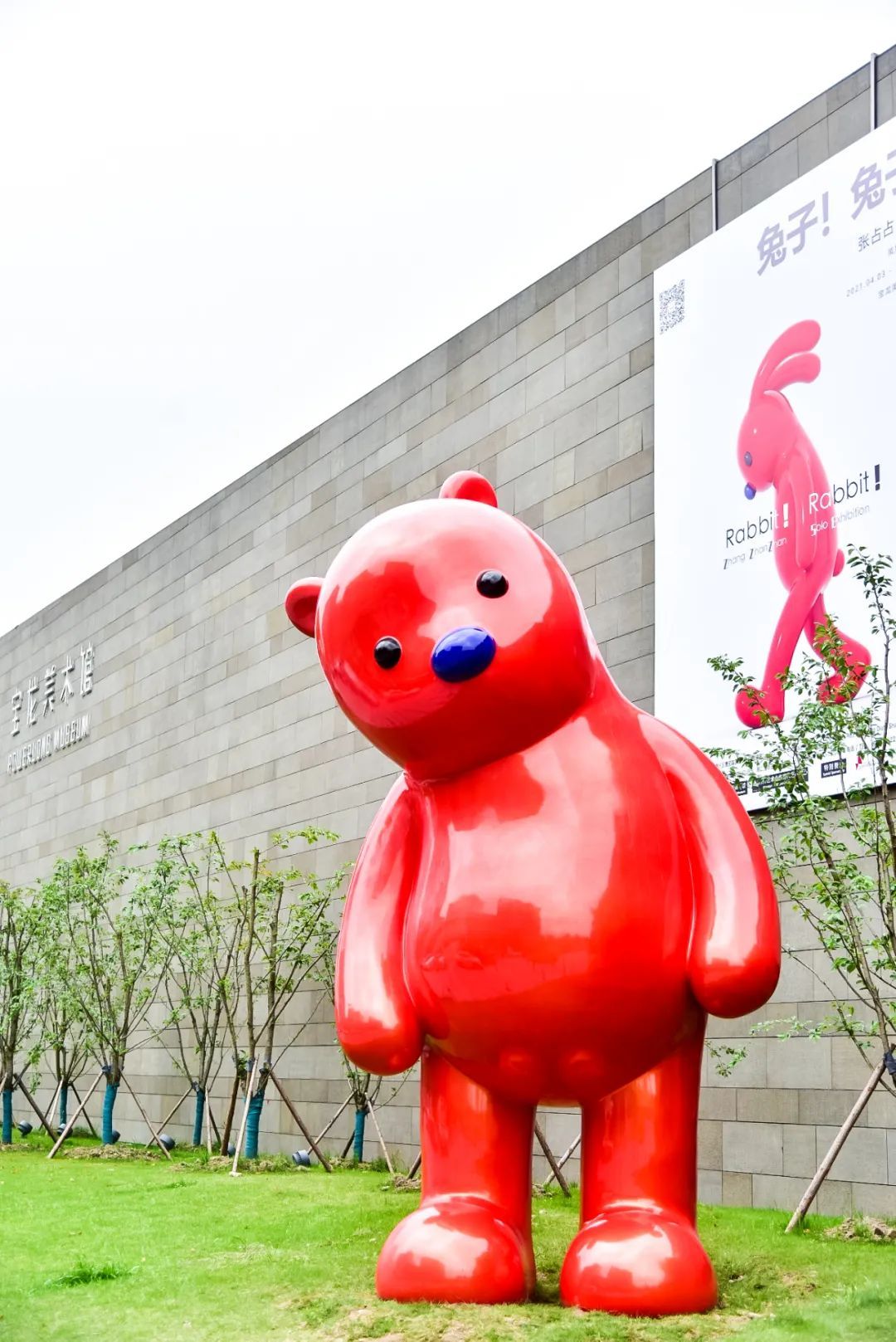 来到宝龙美术馆,远远就能看到约4米高的大型红色“PUPU熊”,歪着脑袋立在葱葱绿绿的草坪上,萌萌的,非常可爱,这也是此次展览的一大看点。