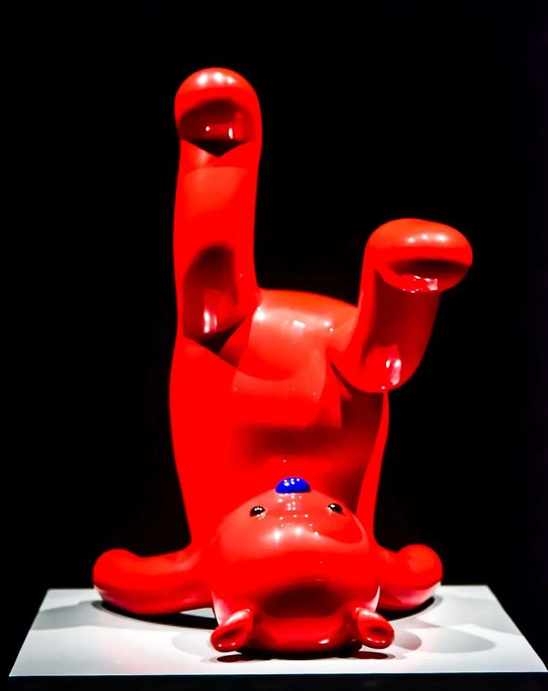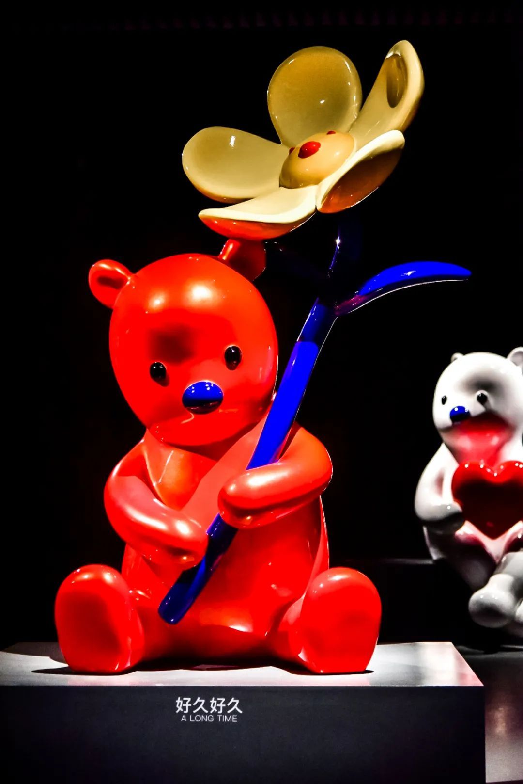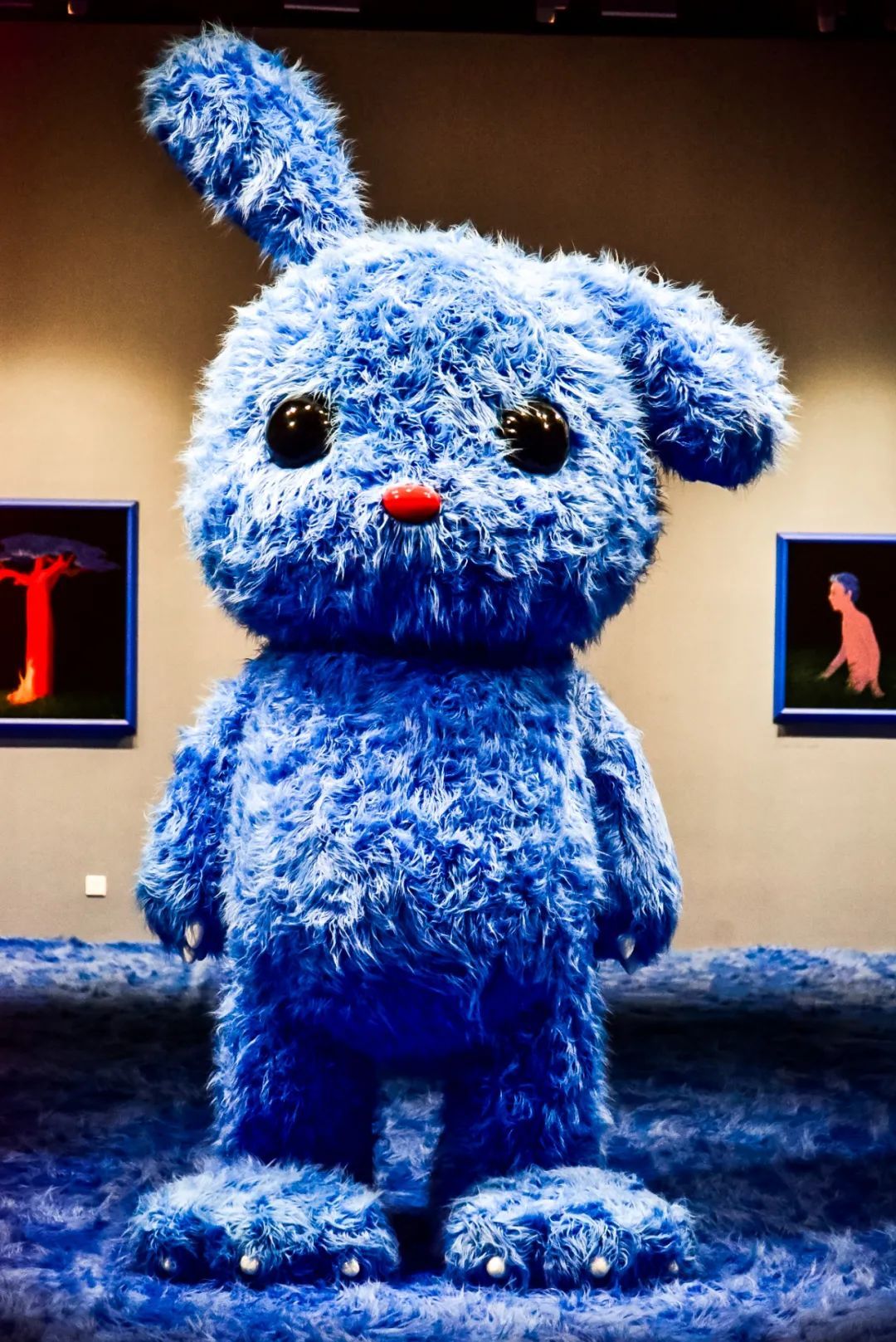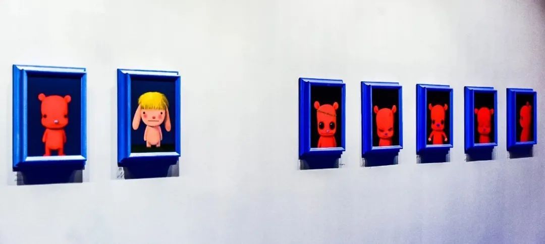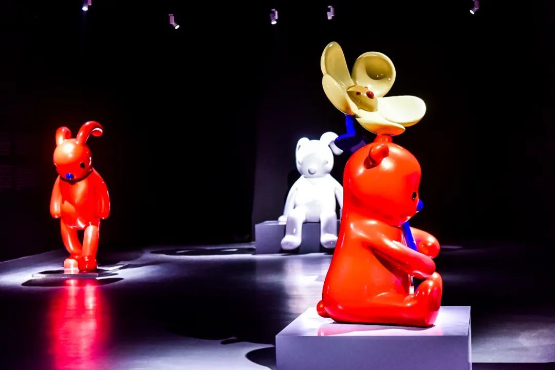 红色PUPU熊是张占占最有代表性的作品,此次展出作品中,还有一件该系列的涂鸦雕塑。展出现场,可爱的兔子与PUPU熊相得益彰,有的站着,有的躺着,还有的似乎要飞起来,给观众塑造了一个放松的童真世界。