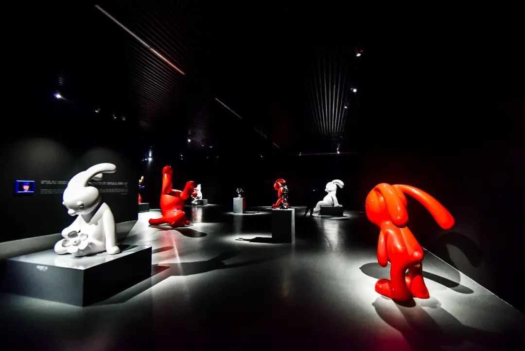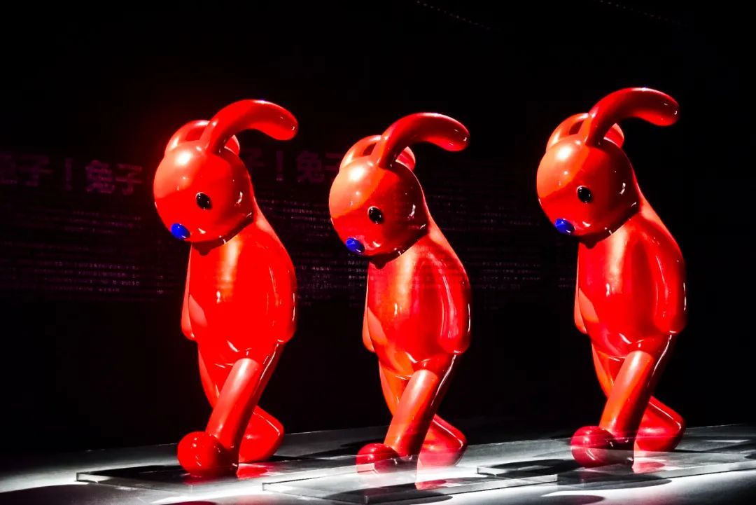 进入展厅,电镀不锈钢与玻璃钢烤漆材质的兔子雕塑便呈现在眼前,前卫、潮流、呆萌的造型传递了童真的一面,引来了不少观众驻足。值得注意的是,这些作品中,基本没有对视的眼神交流,在寂静中营造出孤独的气氛,但又让人忍不住想走近了解。