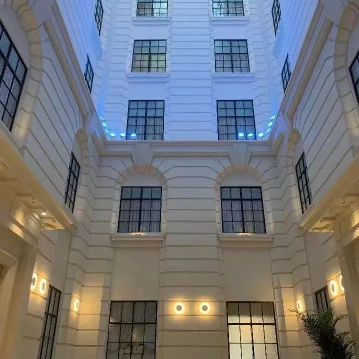室内部分,对中庭重新进行合理布局,按照设计图纸补配原型号、划格样式的钢窗,同时在内立面采用墙面GRG进行装修施工,做出柱式、门窗套、檐部线脚等装饰构件,恢复中庭新古典主义的整体效果,中庭的泛光照明设有7款模式,满足不同场景的使用需求。