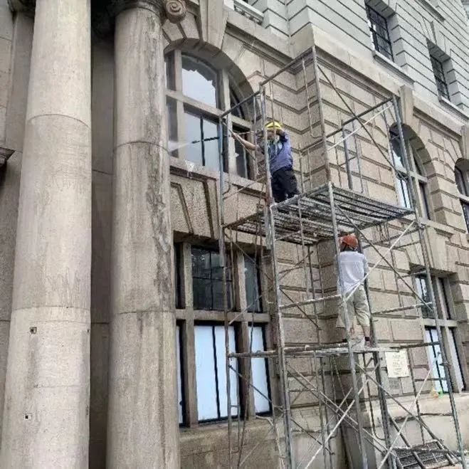 外墙部分,保留了经典的花岗石面砖砌,并对外墙花岗石的大面积清洗、特别是柱式、山花、门窗套、檐部等装饰线脚处,针对局部损坏部位进行小范围修补。对变形翘曲的钢门窗进行统一矫正,框料出白后重新涂刷防锈漆,再安装补配玻璃及五金件,建筑外观修旧如旧,却又焕然一新。